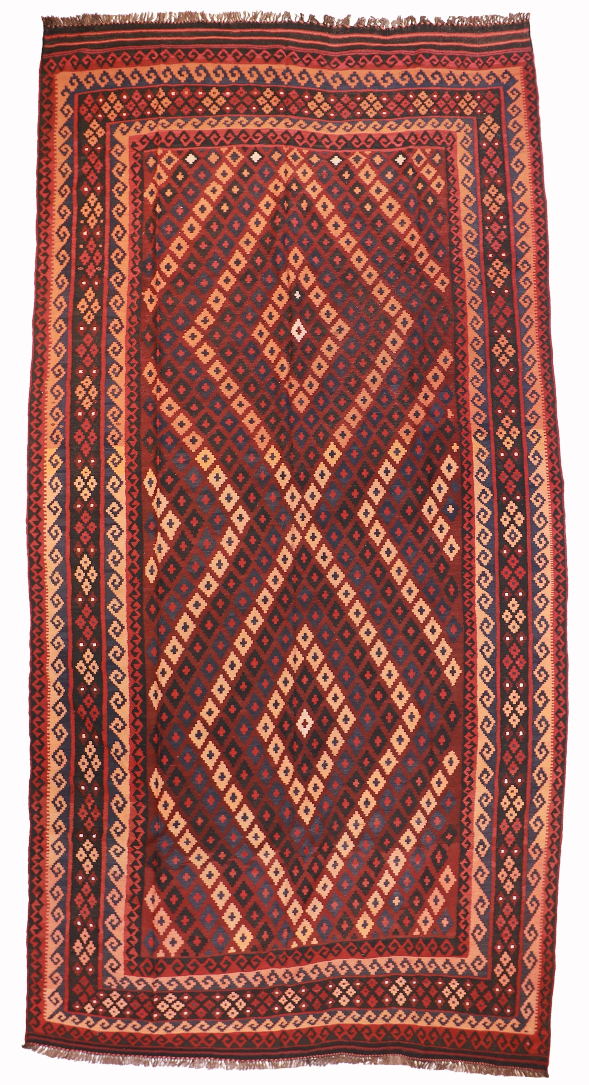 This exquisite 8.8x15.7 Kilim rug from Afghanistan boasts a vibrant color palette, featuring shades of Red, Black, Brown, Navy, Orange. Crafted with wool, this rug showcases a traditional Kilim design that adds a touch of elegance and a timeless charm to any space. With a thickness of 3/8 inch, this rectangular rug offers durability and comfort underfoot. Its size covers an impressive area, making it suitable for larger rooms. The Flatweave construction further enhances its durability, making it a perfect addition for high-traffic areas. Embrace the beauty and craftsmanship of this Kilim rug in your home.