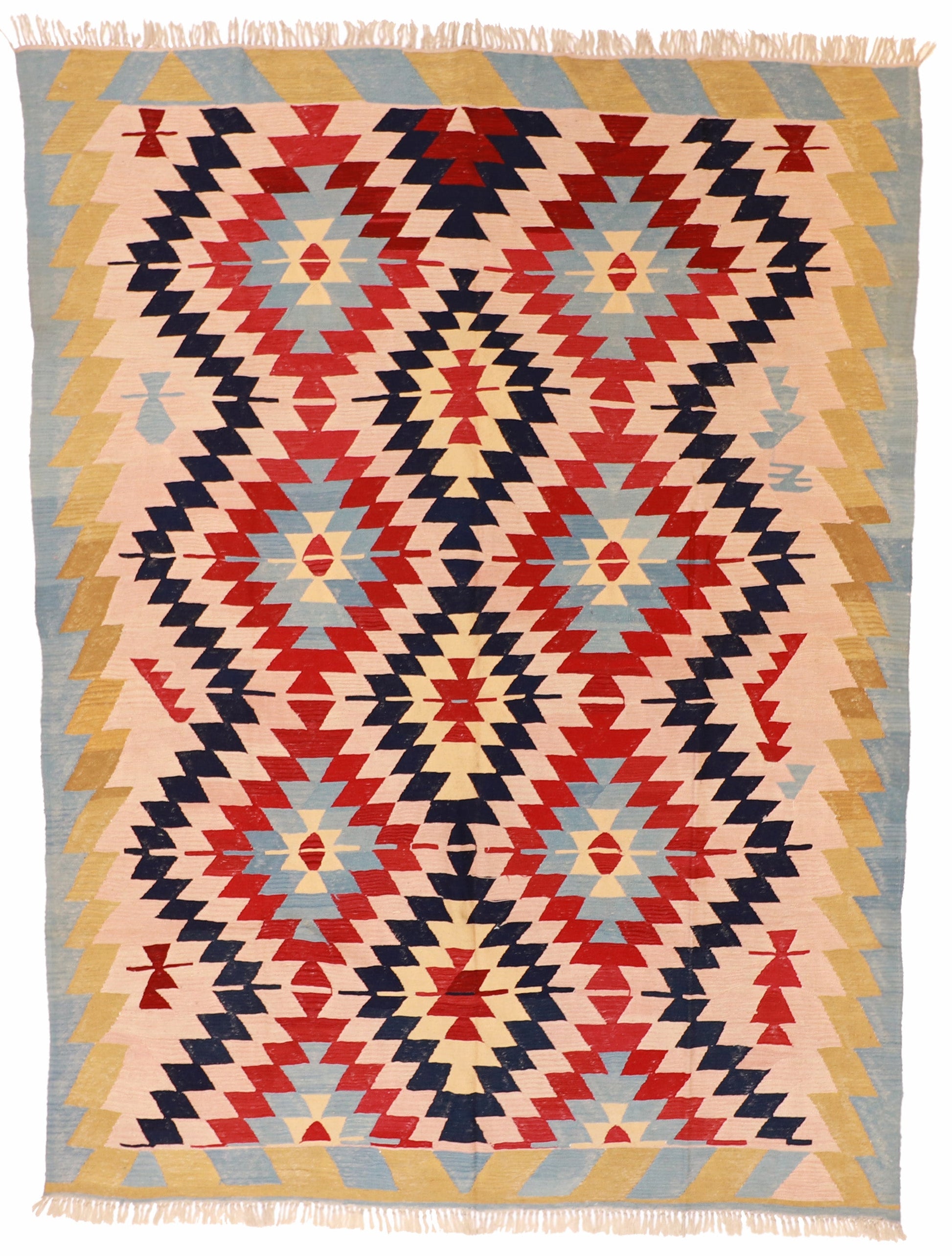 This exquisite 8.3x11.1 Kilim rug from Turkey boasts a vibrant color palette, featuring shades of Navy, Red, Beige, Tan, Rose. Crafted with fine/wool, this rug showcases a traditional Kilim design that adds a touch of elegance and a timeless charm to any space. With a thickness of 3/8 inch, this rectangular rug offers durability and comfort underfoot. Its size covers an impressive area, making it suitable for larger rooms. The Flatweave construction further enhances its durability, making it a perfect addition for high-traffic areas. Embrace the beauty and craftsmanship of this Kilim rug in your home.