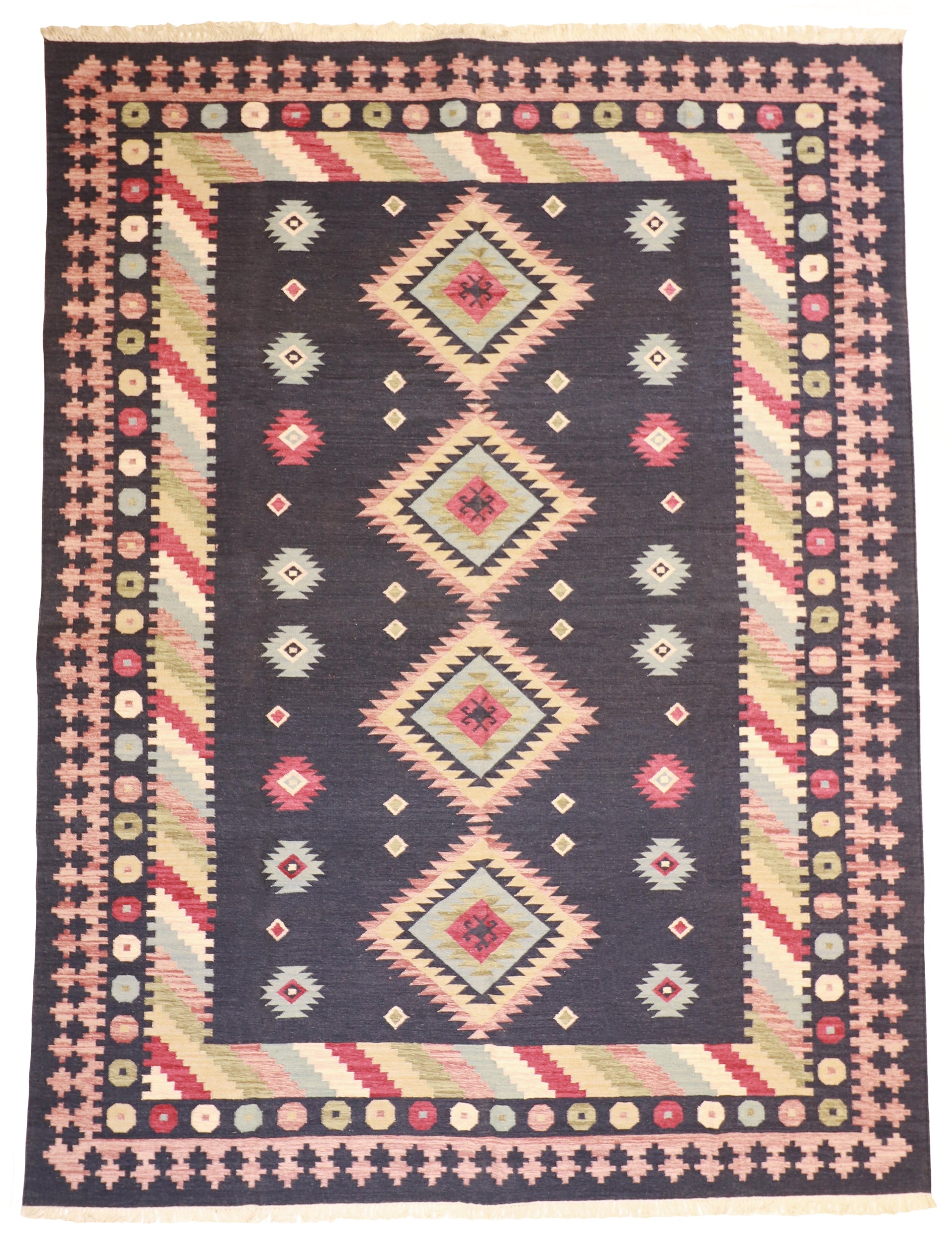 Introducing our stunning Kilim rug from India. This eye-catching rug features an all-over design in a range of vibrant colors including Blue, Beige, Rose. Crafted with care, this wool material rug is perfect for adding warmth and style to any room. The rectangular shape and dimensions of 9' width and 12' length make it an ideal fit for various spaces. With a thickness of 1/4", this flatweave rug is both durable and comfortable underfoot. Its generous size ensures ample coverage. Bring a touch of elegance and cultural charm to your home with this exquisite Kilim rug.