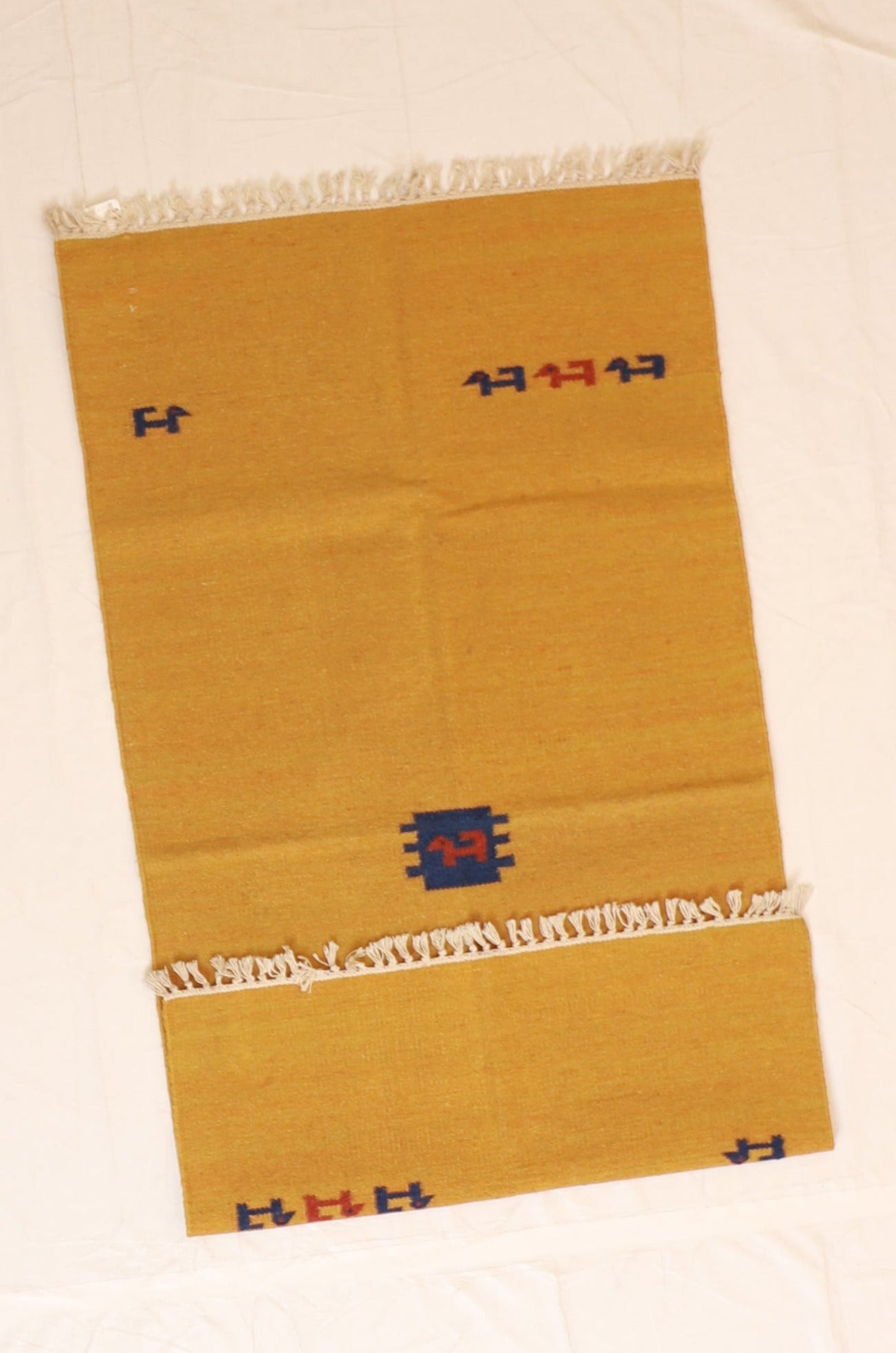Introducing our stunning Kilim rug from India. This eye-catching rug features an all-over design in a range of vibrant colors including Yellow, Orange, Blue. Crafted with care, this fine material rug is perfect for adding warmth and style to any room. The rectangular shape and dimensions of 3' width and 5' length make it an ideal fit for various spaces. With a thickness of 1/4", this flatweave rug is both durable and comfortable underfoot. Its generous size ensures ample coverage. Bring a touch of elegance and cultural charm to your home with this exquisite Kilim rug.