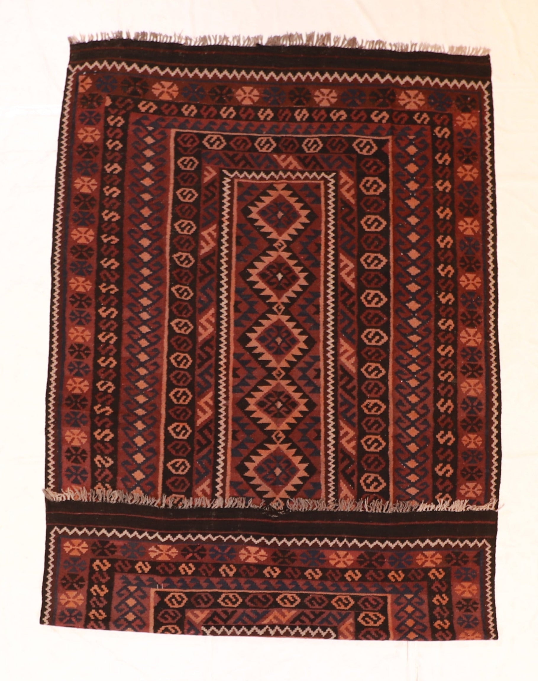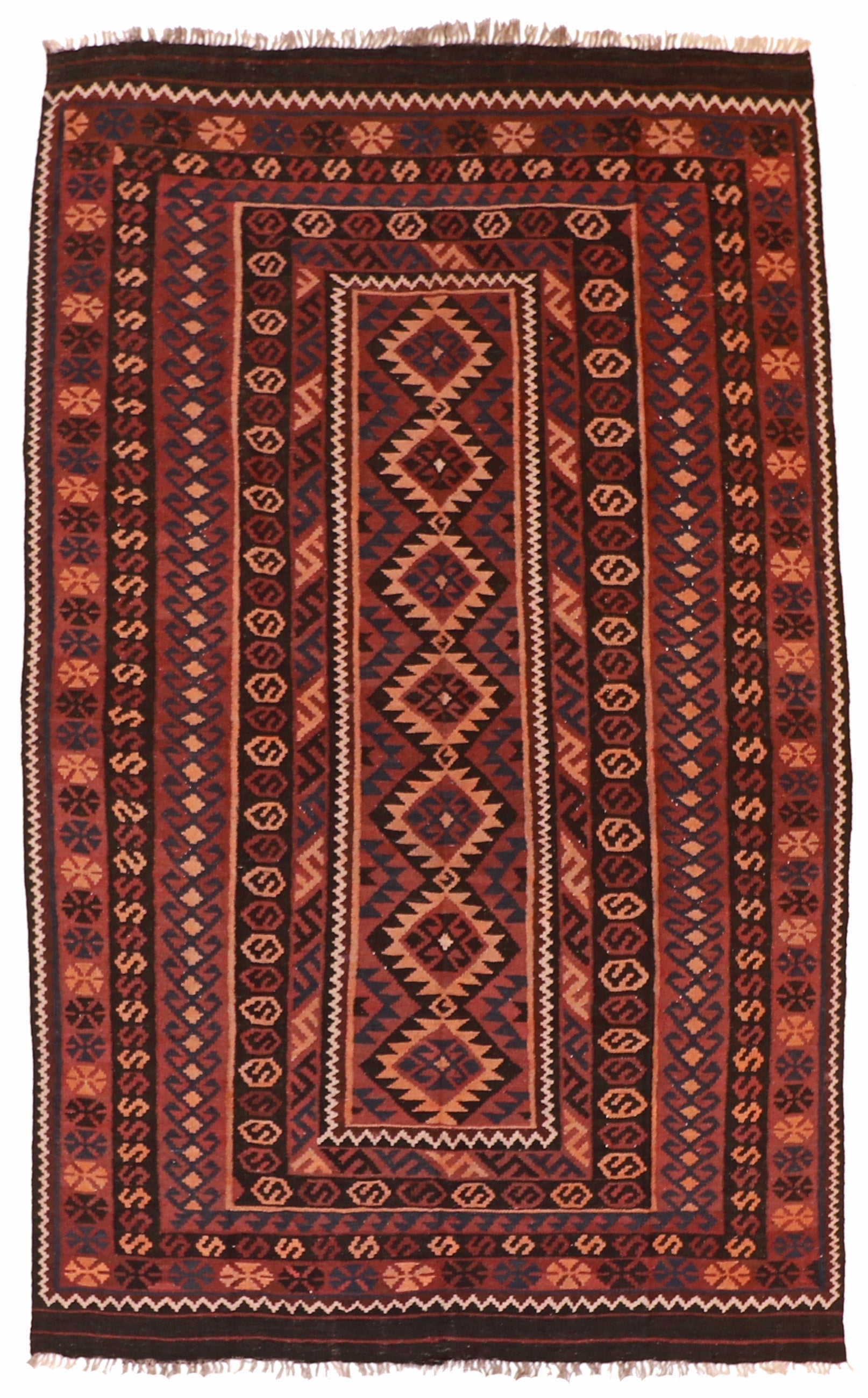 This exquisite 6.7x10.6 Kilim rug from Afghanistan boasts a vibrant color palette, featuring shades of Rust, Red, Black, Navy. Crafted with wool, this rug showcases a traditional Kilim design that adds a touch of elegance and a timeless charm to any space. With a thickness of 3/8 inch, this rectangular rug offers durability and comfort underfoot. Its size covers an impressive area, making it suitable for larger rooms. The Flatweave construction further enhances its durability, making it a perfect addition for high-traffic areas. Embrace the beauty and craftsmanship of this Kilim rug in your home.