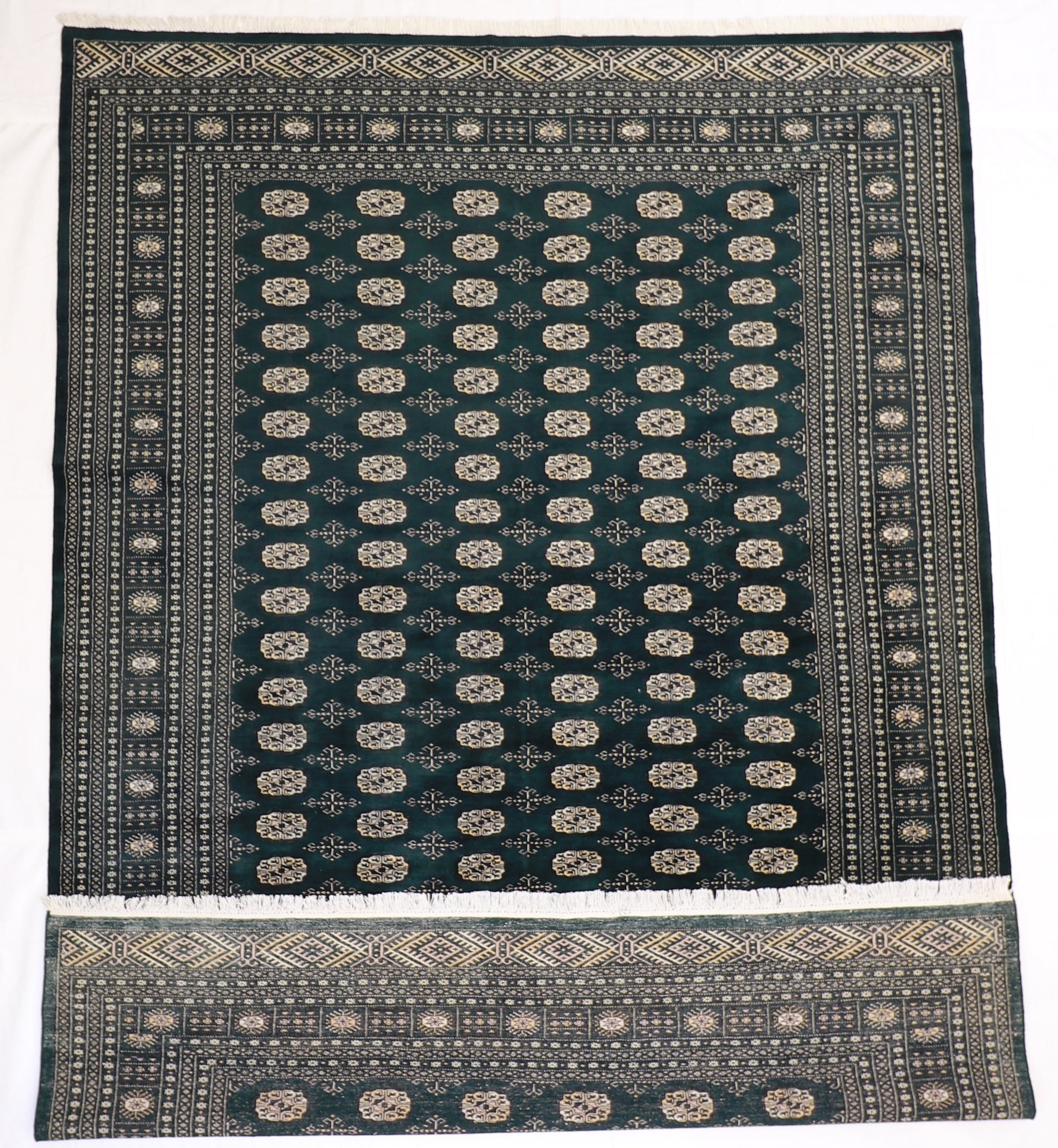 Experience the elegance of our Pakistani Bokhara rug. With a color palette including Green, Beige, and Tan, it brings a harmonious blend of earthy tones to your decor. The Geometric design adds a touch of symmetry and sophistication to your space, while the Rectangle shape effortlessly complements any room. Measuring 9x12 feet with a thickness of 1/4 inch, it offers both style and comfort. Crafted from fine material, it ensures durability and a luxurious texture. This Pile rug covers impressive area and reflects the artistry and heritage of Pakistani craftsmanship. Embrace the timeless allure of this Bokhara Pile rug and let it transform your living space with elegance.