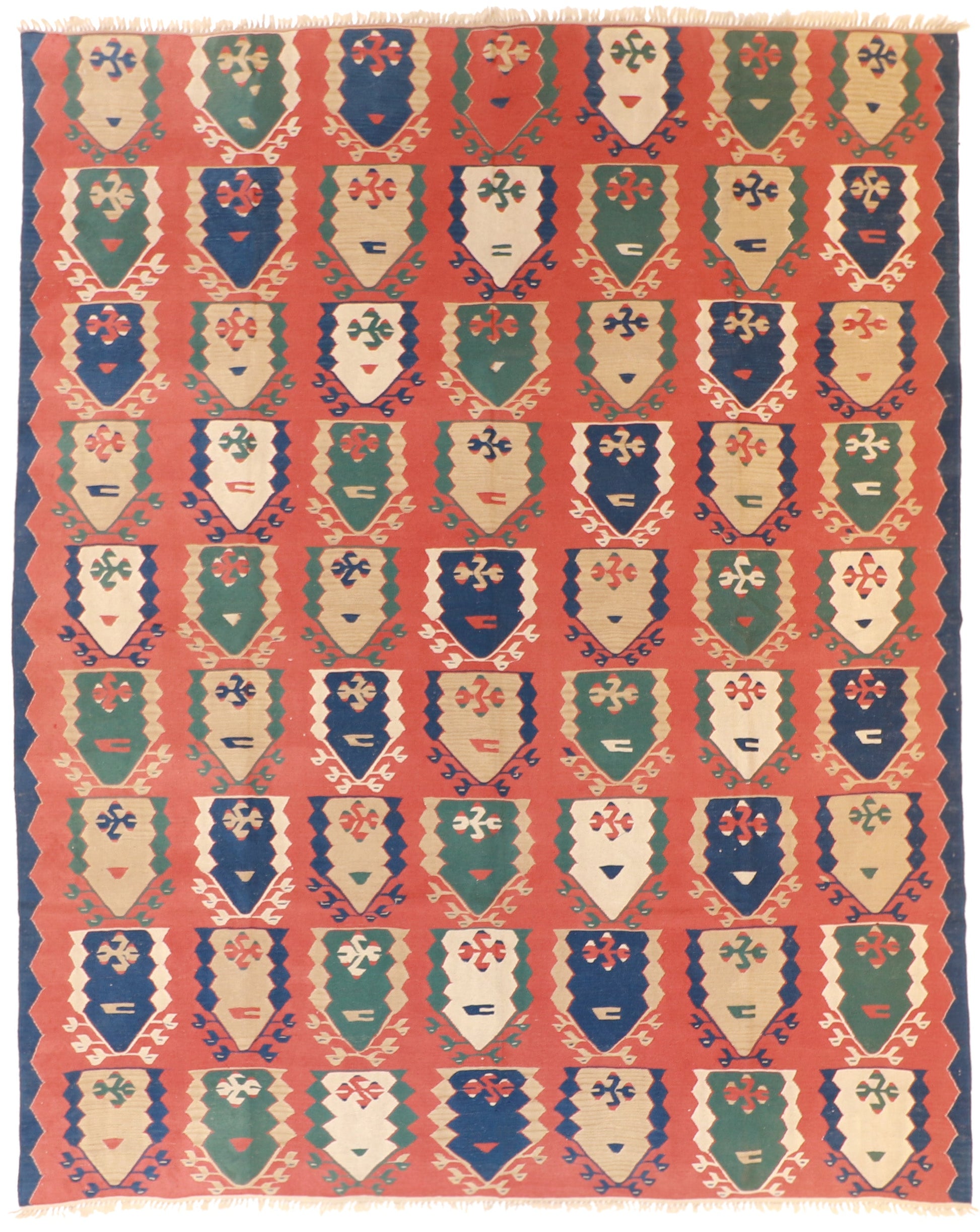 This exquisite 9.1x11.4 Kilim rug from Turkey boasts a vibrant color palette, featuring shades of Burnt Orange, Beige, Green, Blue. Crafted with wool, this rug showcases a traditional Kilim design that adds a touch of elegance and a timeless charm to any space. With a thickness of 3/8 inch, this rectangular rug offers durability and comfort underfoot. Its size covers an impressive area, making it suitable for larger rooms. The Flatweave construction further enhances its durability, making it a perfect addition for high-traffic areas. Embrace the beauty and craftsmanship of this Kilim rug in your home.