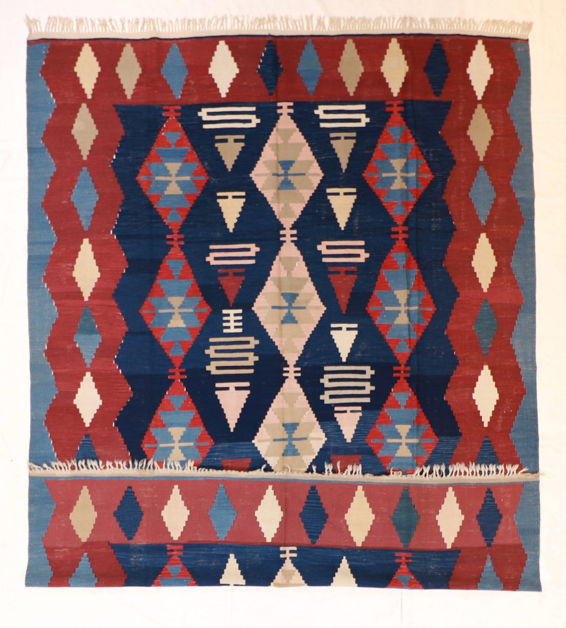 This exquisite 8.5x11.8 Kilim rug from Turkey boasts a vibrant color palette, featuring shades of Blue, Beige, Red. Crafted with wool, this rug showcases a traditional Kilim design that adds a touch of elegance and a timeless charm to any space. With a thickness of 3/8 inch, this rectangular rug offers durability and comfort underfoot. Its size covers an impressive area, making it suitable for larger rooms. The Flatweave construction further enhances its durability, making it a perfect addition for high-traffic areas. Embrace the beauty and craftsmanship of this Kilim rug in your home.