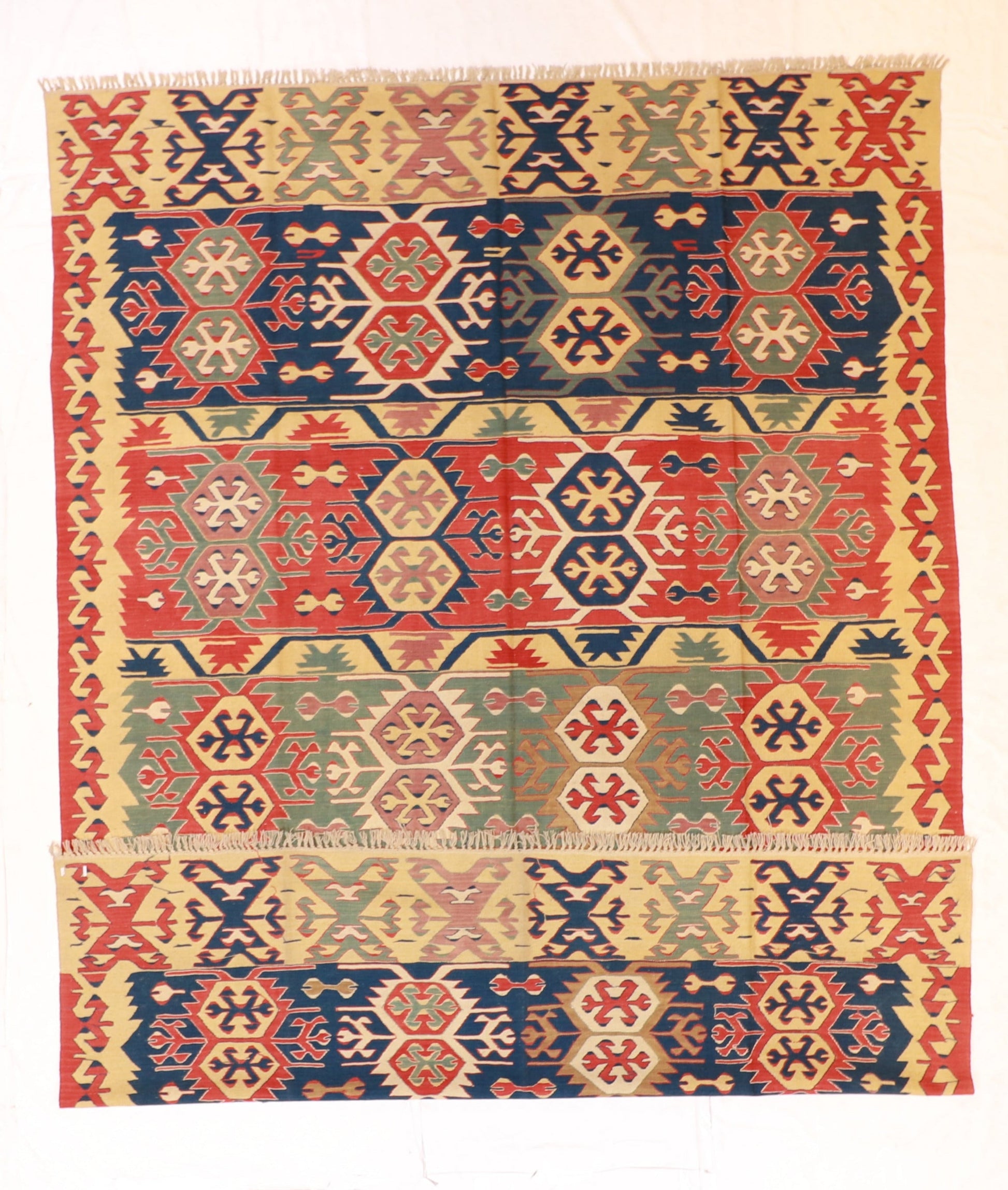 This exquisite 8.10x12.5 Kilim rug from Turkey boasts a vibrant color palette, featuring shades of Cream, Red, Green, Blue. Crafted with fine/wool, this rug showcases a traditional Kilim design that adds a touch of elegance and a timeless charm to any space. With a thickness of 3/8 inch, this rectangular rug offers durability and comfort underfoot. Its size covers an impressive area, making it suitable for larger rooms. The Flatweave construction further enhances its durability, making it a perfect addition for high-traffic areas. Embrace the beauty and craftsmanship of this Kilim rug in your home.
