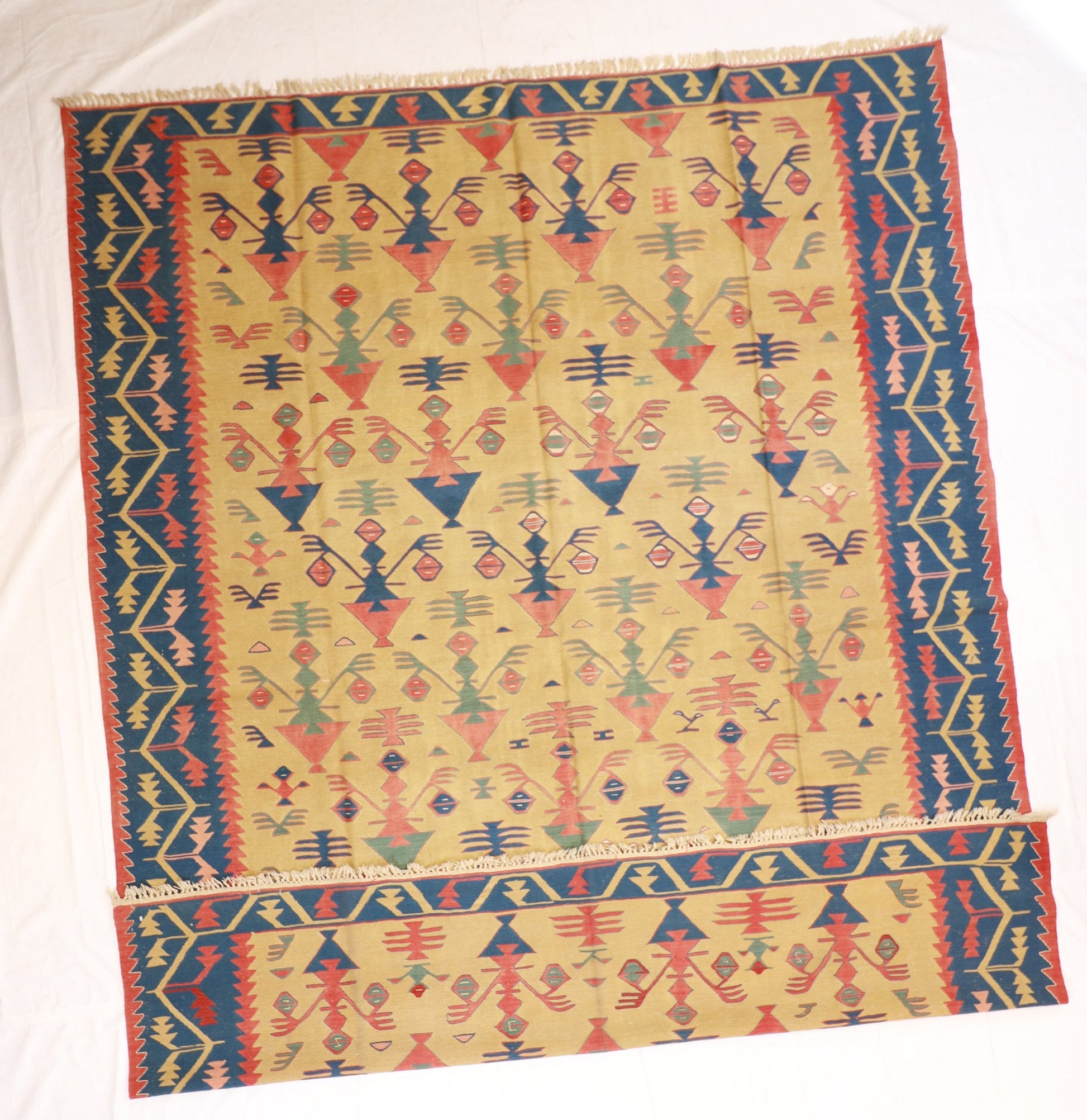 This exquisite 9.7x12.6 Kilim rug from Turkey boasts a vibrant color palette, featuring shades of Tan, Lilac, Blue, Green. Crafted with fine/wool, this rug showcases a traditional Kilim design that adds a touch of elegance and a timeless charm to any space. With a thickness of 3/8 inch, this rectangular rug offers durability and comfort underfoot. Its size covers an impressive area, making it suitable for larger rooms. The Flatweave construction further enhances its durability, making it a perfect addition for high-traffic areas. Embrace the beauty and craftsmanship of this Kilim rug in your home.