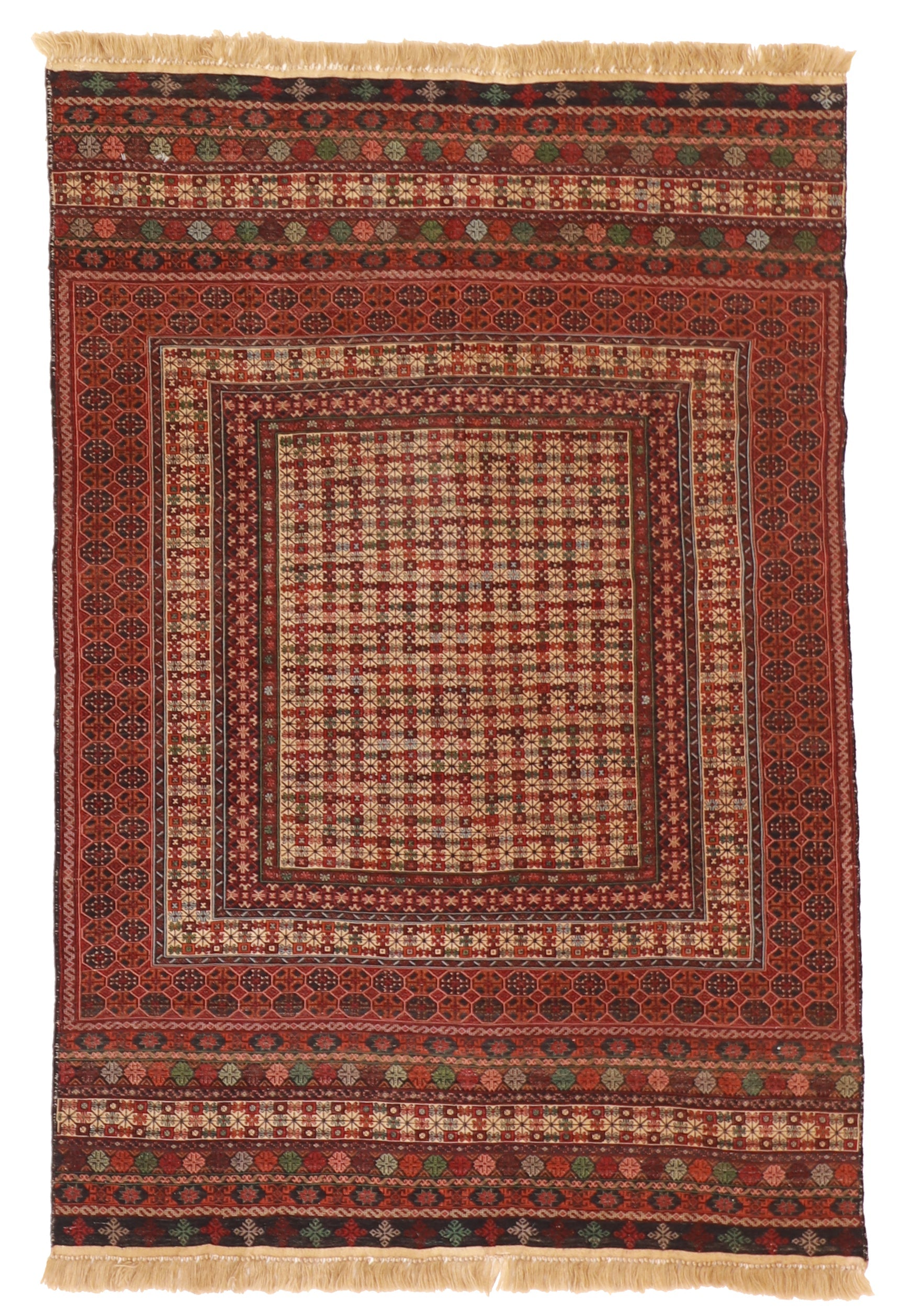 This exquisite 4x5.8 Azari rug from Pakistan boasts a vibrant color palette, featuring shades of Brown, Tan, Maroon, Green, Blue, Grey. Crafted with Fine/Wool, this rug showcases a traditional Azari design that adds a touch of elegance and a timeless charm to any space. With a thickness of 3/8 inch, this rectangular rug offers durability and comfort underfoot. Its size covers an impressive area, making it suitable for larger rooms. The Flatweave construction further enhances its durability, making it a perfect addition for high-traffic areas. Embrace the beauty and craftsmanship of this Azari rug in your home.