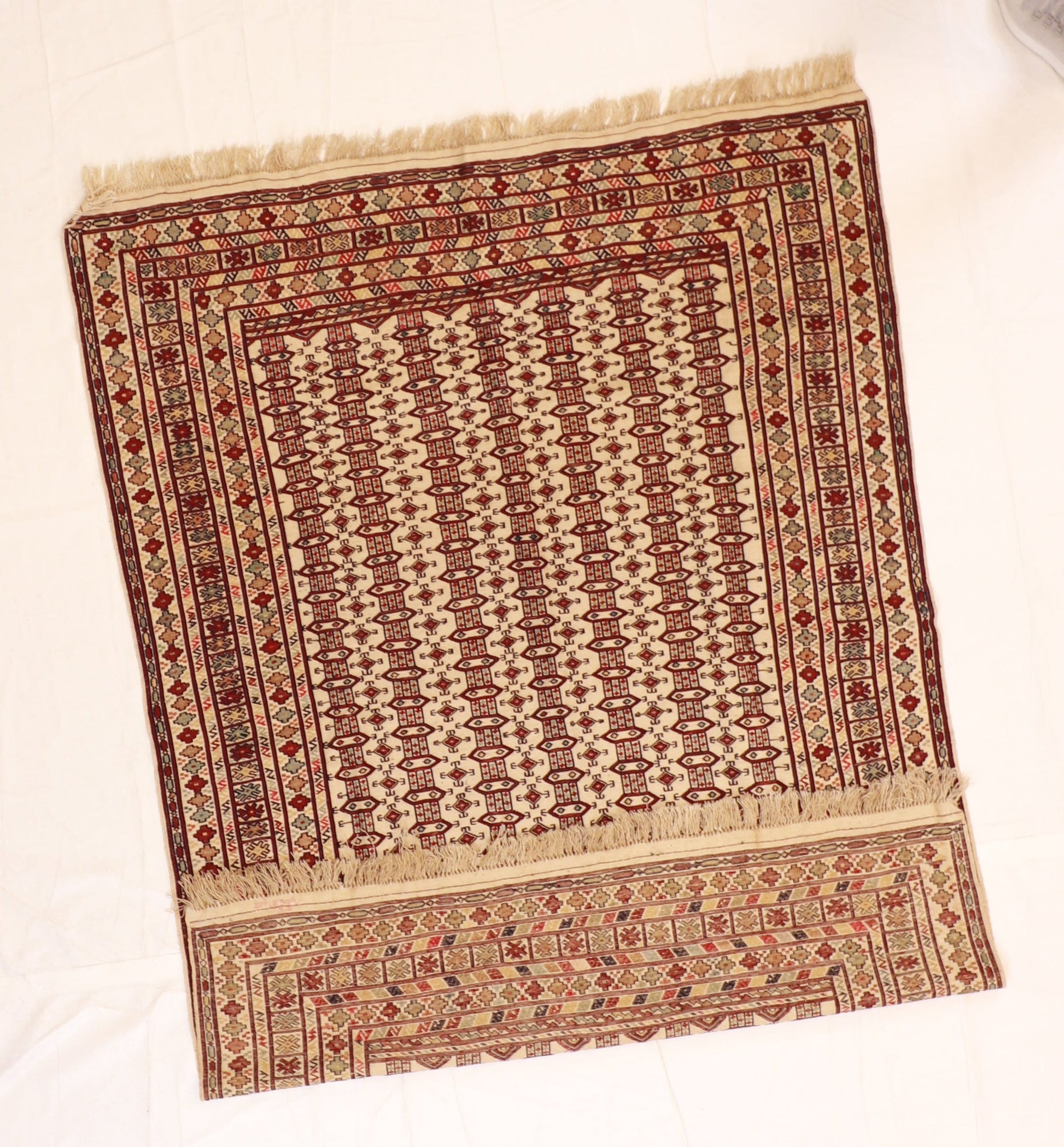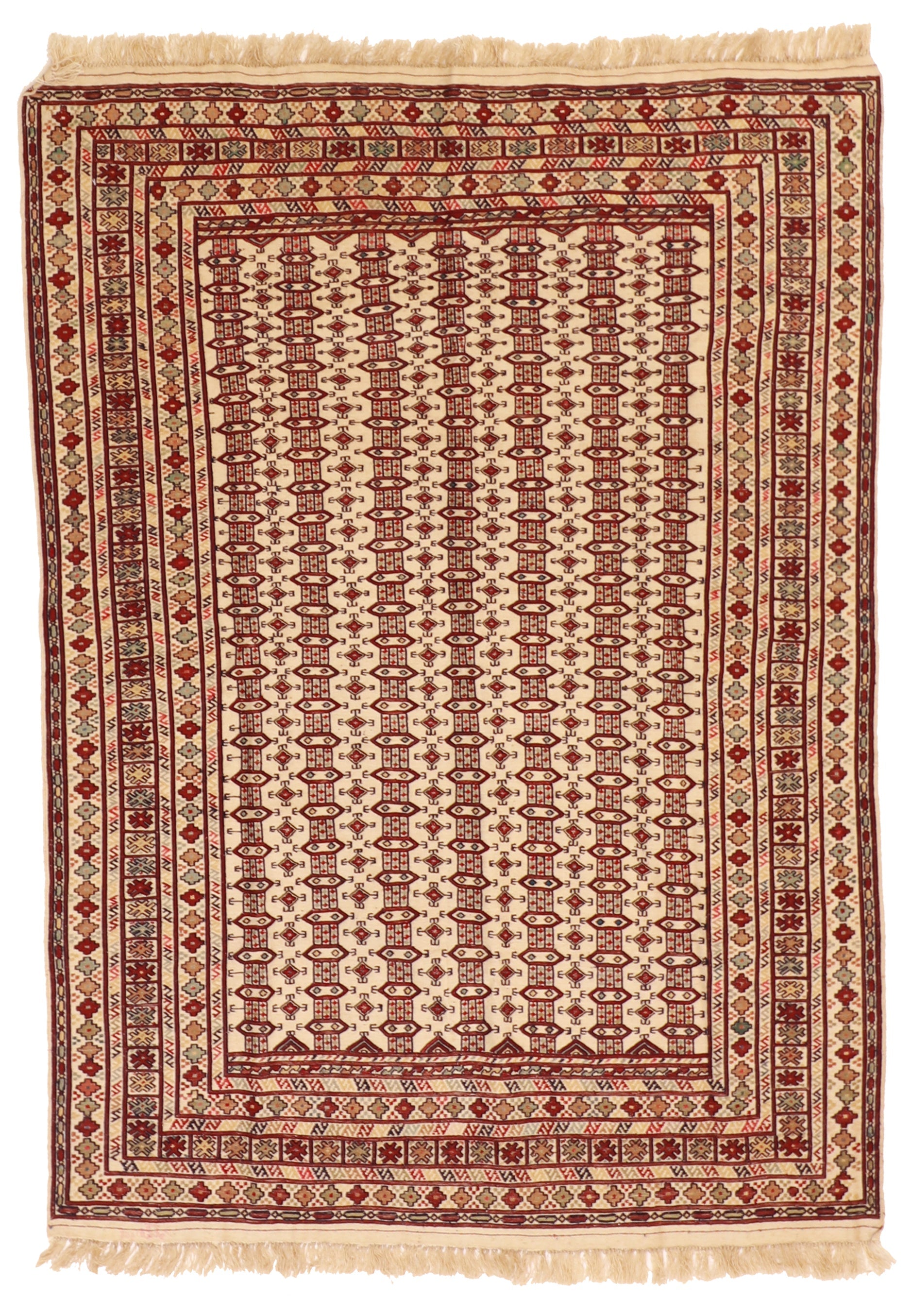 Introducing a stunning Baluch rug from Afghanistan, featuring a captivating geometric design. With its vibrant colors including Maroon, Cream, Green, this rug is sure to bring life to any room. Made of high-quality wool, it offers both comfort and durability. The rectangle shape, measuring 4.5x6 feet, fits well in various spaces. With a thickness of 1/4 inch, this pile rug is perfect for those who prefer a sleek and low-profile look.