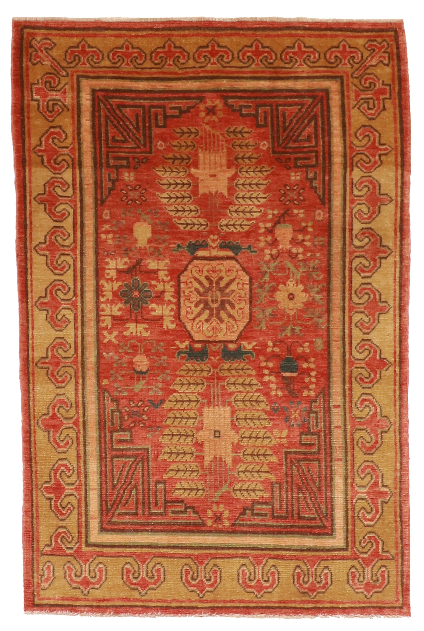 This exquisite 3x4.6 Khotan rug from Azerbaijan boasts a vibrant color palette, featuring shades of Red, Tan, Green, Brown. Crafted with Fine/Wool, this rug showcases a traditional Khotan design that adds a touch of elegance and a timeless charm to any space. With a thickness of 3/8 inch, this rectangular rug offers durability and comfort underfoot. Its size covers an impressive area, making it suitable for larger rooms. The Pile construction further enhances its durability, making it a perfect addition for high-traffic areas. Embrace the beauty and craftsmanship of this Khotan rug in your home.