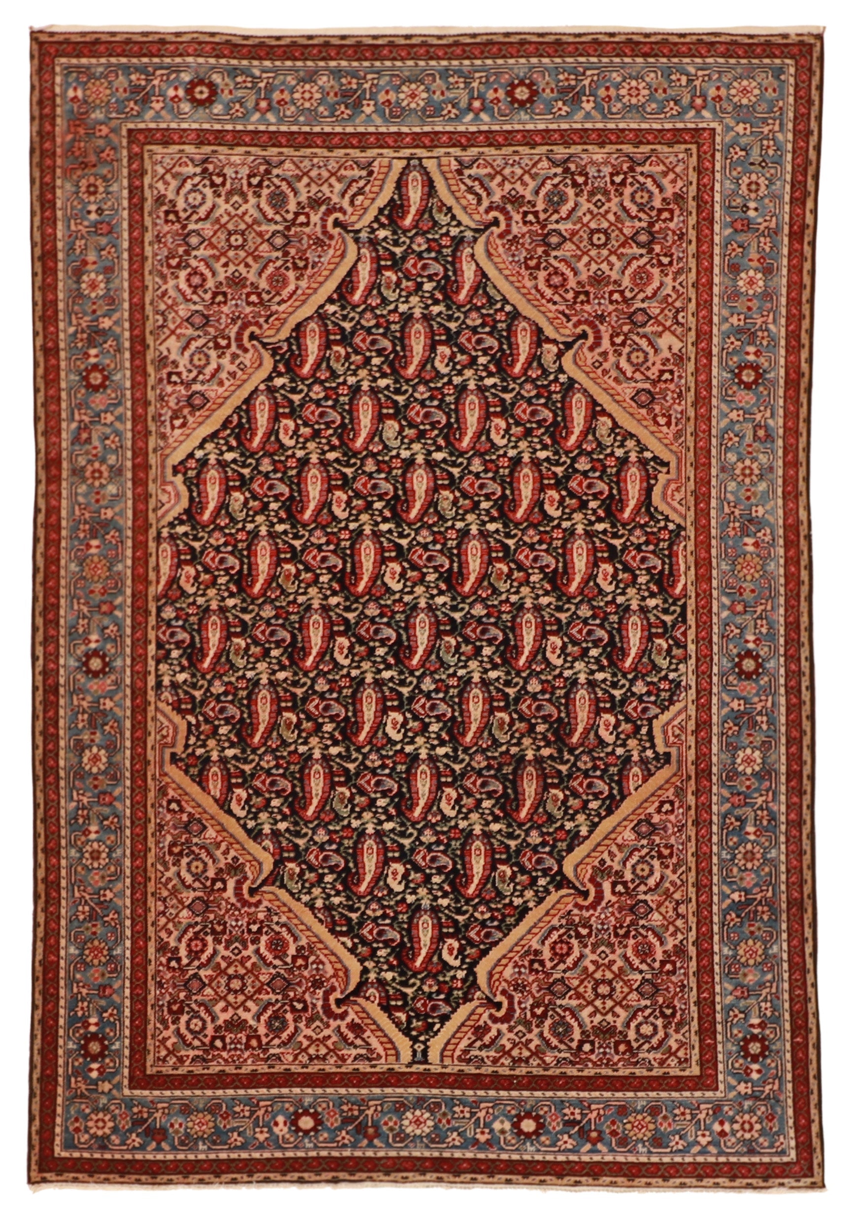 Introducing a stunning Seneh rug from Persia, perfect for adding a touch of luxury to your space. This exquisite rug features an geometric design in captivating colors of Rust, Maroon, Black, Blue, Beige creating a striking visual appeal. Crafted with attention to detail, it showcases a beautiful combination of colors and intricate patterns.