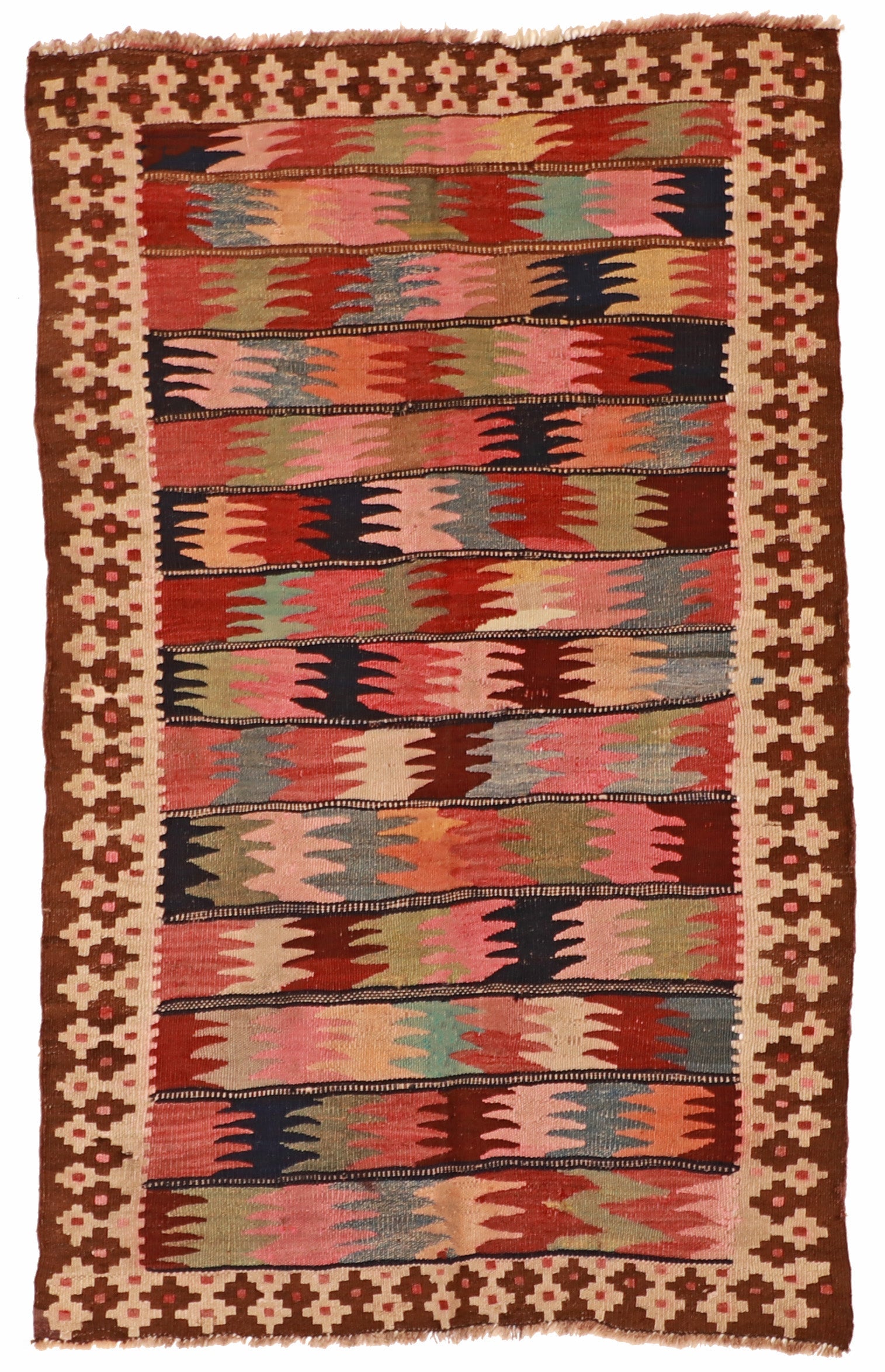 This exquisite 3.9x6.1 Kilim rug from Persia boasts a vibrant color palette, featuring shades of Brown, Beige, Navy, Pink, Blue, Teal, Tan, Rust. Crafted with Antique/Wool, this rug showcases a traditional Kilim design that adds a touch of elegance and a timeless charm to any space. With a thickness of 3/8 inch, this rectangular rug offers durability and comfort underfoot. Its size covers an impressive area, making it suitable for larger rooms. The Flatweave construction further enhances its durability, making it a perfect addition for high-traffic areas. Embrace the beauty and craftsmanship of this Kilim rug in your home.
