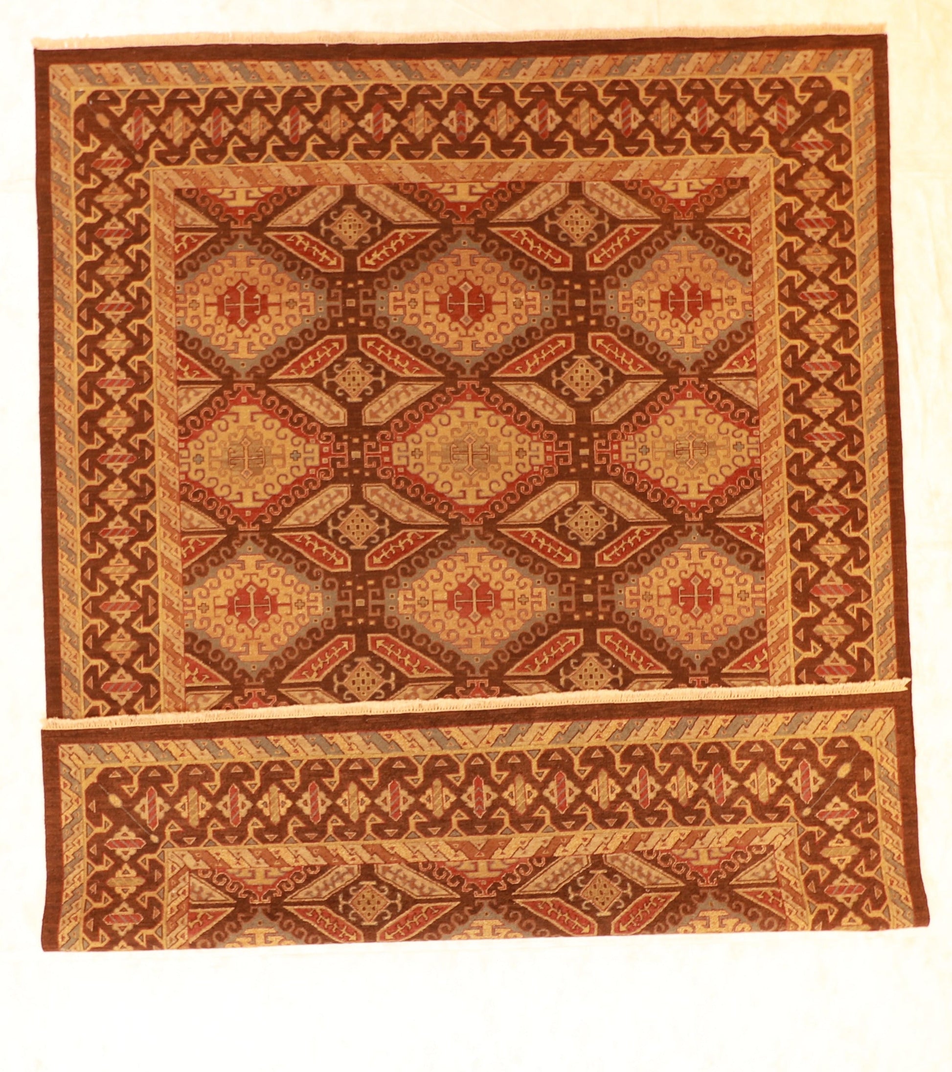 Introducing a stunning Heriz rug from Pakistan, with vibrant colors of Brown, Gold, Tan, Blue, Red. The all-over design showcases intricate patterns that add a touch of traditional elegance to any space. This rectangular rug measures 9x11.11 feet. Crafted with fine materials, it boasts a pile height of 3/8 inch, providing a plush and comfortable feel underfoot. Whether used as an accent piece or the focal point of a room, this rug is sure to enhance the aesthetic appeal and create a warm and inviting atmosphere in your home.