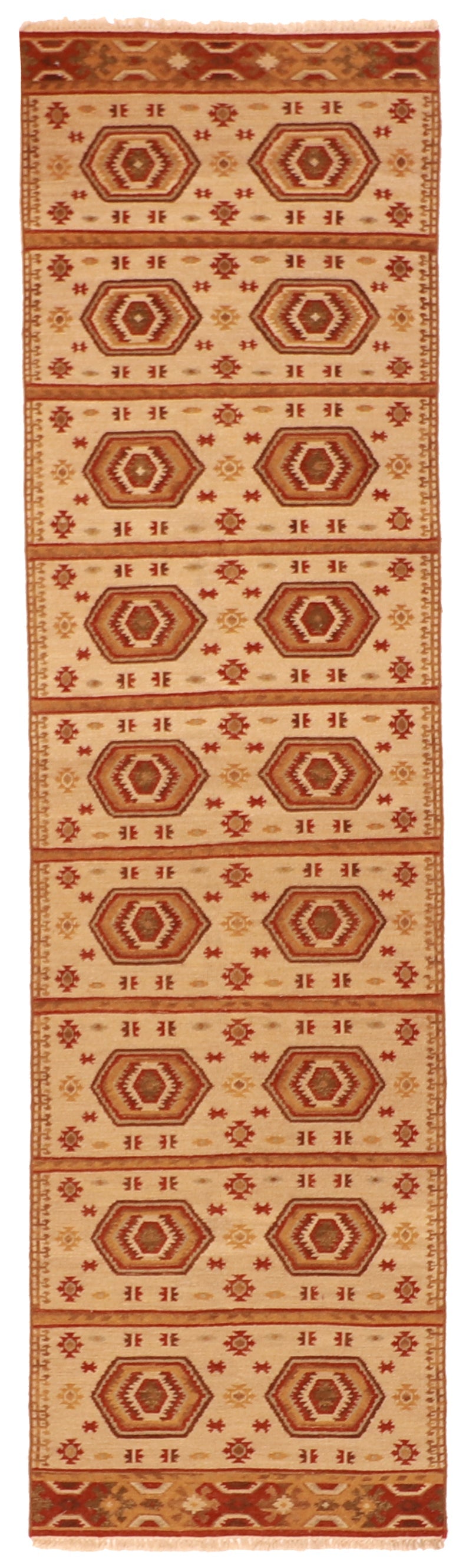 Introducing a stunning rug with a captivating design and exquisite craftsmanship. This Karajeh-style rug features an eye-catching geometric pattern, perfectly blending traditional charm with contemporary elegance. Made with fine wool, it showcases a harmonious combination of colors, including Tan, Brown, adding depth and versatility to any space. With its rectangular shape and dimensions of 2.8x9.9, this rug is ideal for defining and enhancing various areas of your home. Its 1/4-inch thickness offers durability and comfort underfoot. Crafted in India, this high-quality pile rug is a perfect fusion of artistry and functionality.