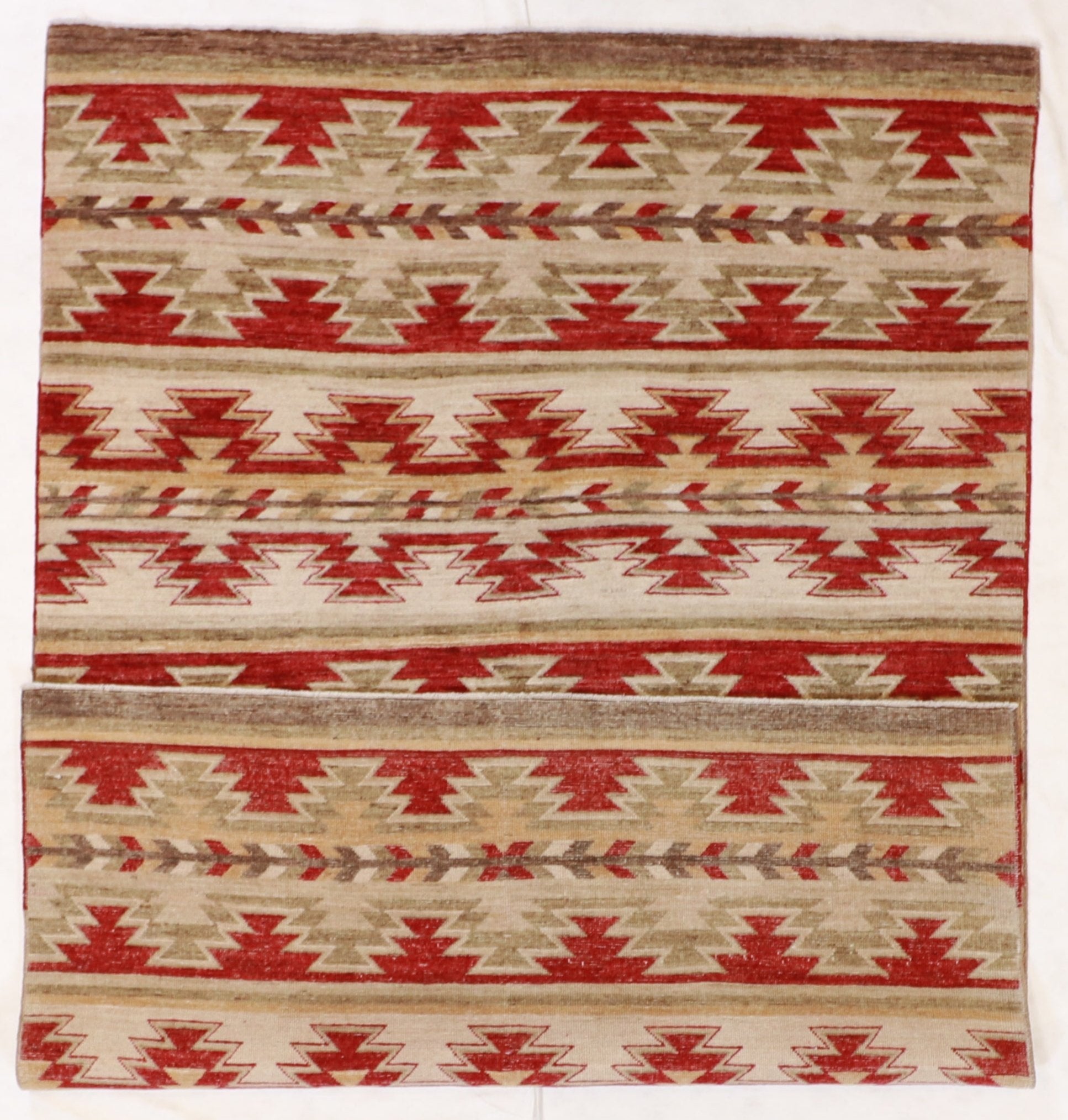 Introducing the exquisite Navajo Geometric Rug from Pak/Persia. This stunning rug boasts a vibrant color palette, featuring shades of Rust, Olive Green, White, Beige, which beautifully complement its geometric design. Made from fine wool materials, it showcases a pile texture that adds to its timeless appeal. Whether adorned in a living room, bedroom, or any space you desire, this Navajo Geometric Rug is sure to enhance the style and elegance of any interior decor.