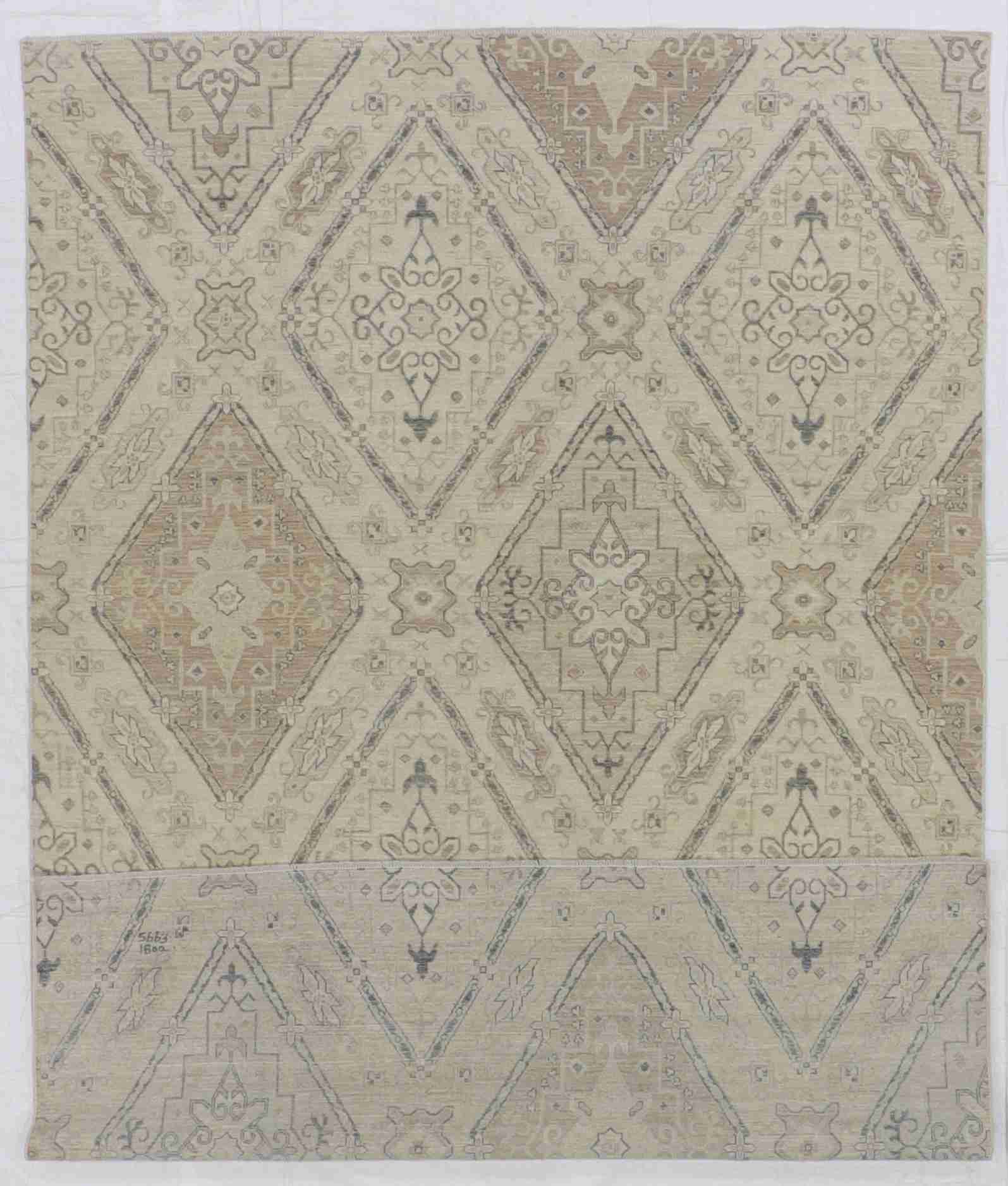 This Transitional is hand-knotted in 100% wool, composed in a refined artisanal vocabulary that reads confident and collected.