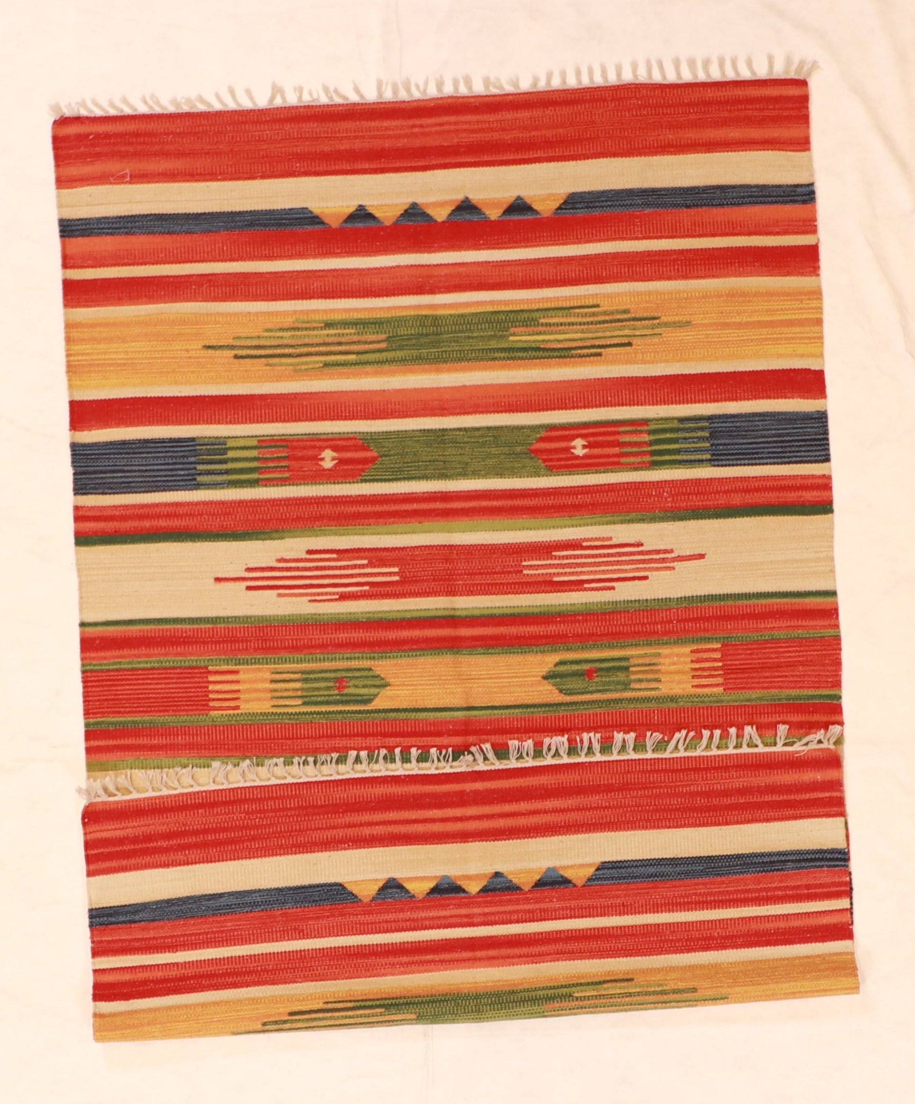 Introducing the exquisite Kilim Geometric Rug from Pakistan. This stunning rug boasts a vibrant color palette, featuring shades of Beige, Green, Yellow, Red which beautifully complement its geometric design. Made from fine wool materials, it showcases a pile texture that adds to its timeless appeal. Whether adorned in a living room, bedroom, or any space you desire, this Kilim Rug is sure to enhance the style and elegance of any interior decor.