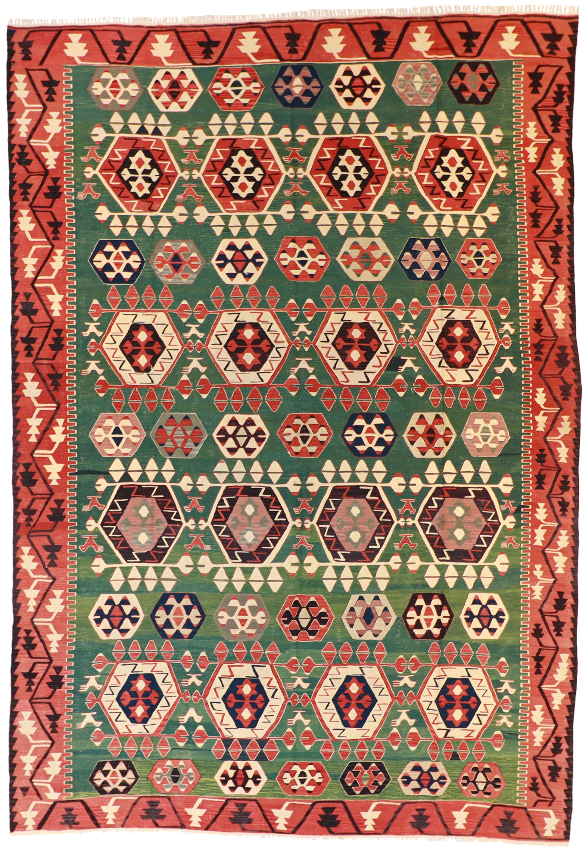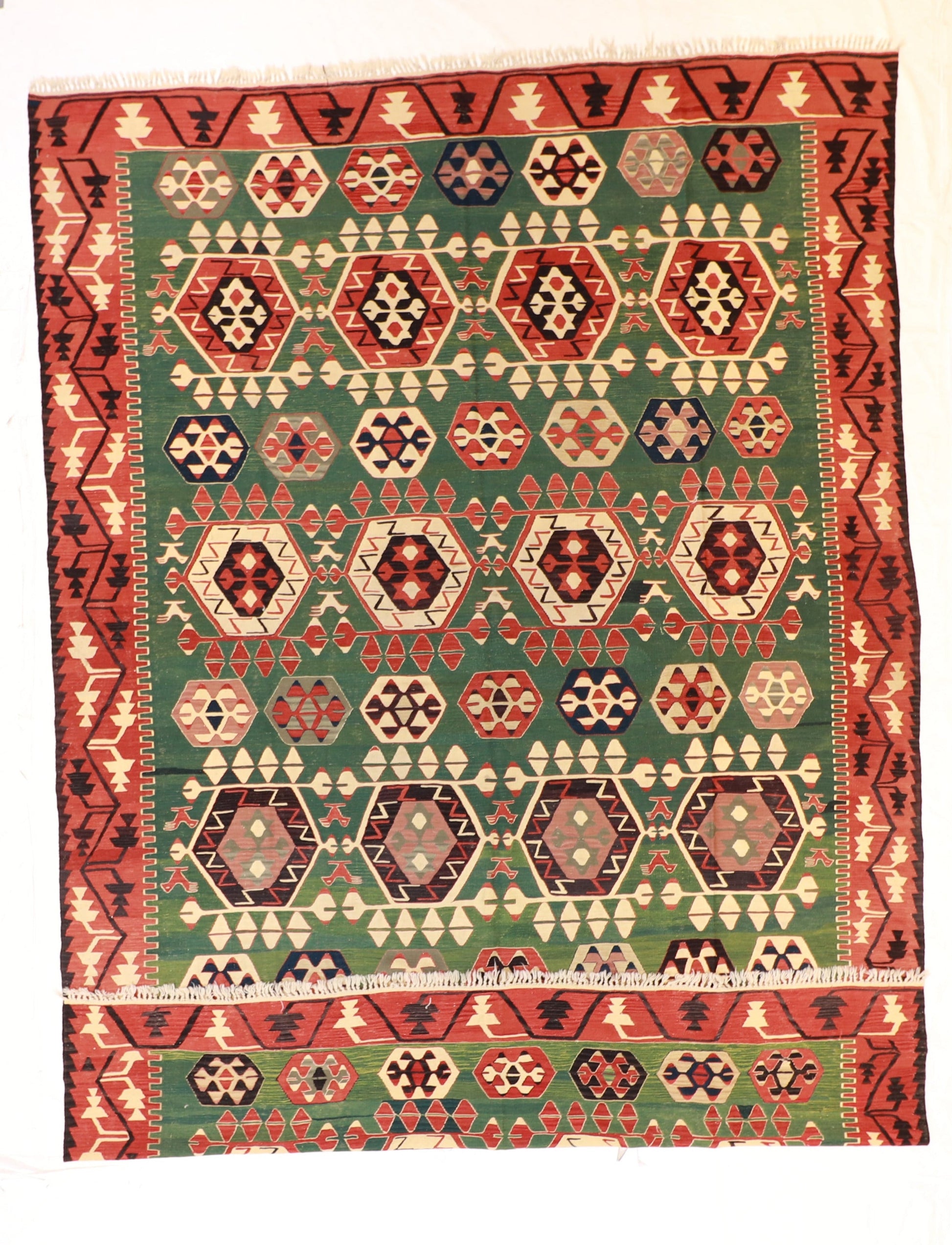 This exquisite 9.10x14 Kilim rug from Pakistan boasts a vibrant color palette, featuring shades of Red, Tan, Green, Black, Brown. Crafted with wool, this rug showcases a traditional Kilim design that adds a touch of elegance and a timeless charm to any space. With a thickness of 3/8 inch, this rectangular rug offers durability and comfort underfoot. Its size covers an impressive area, making it suitable for larger rooms. The Flatweave construction further enhances its durability, making it a perfect addition for high-traffic areas. Embrace the beauty and craftsmanship of this Kilim rug in your home.