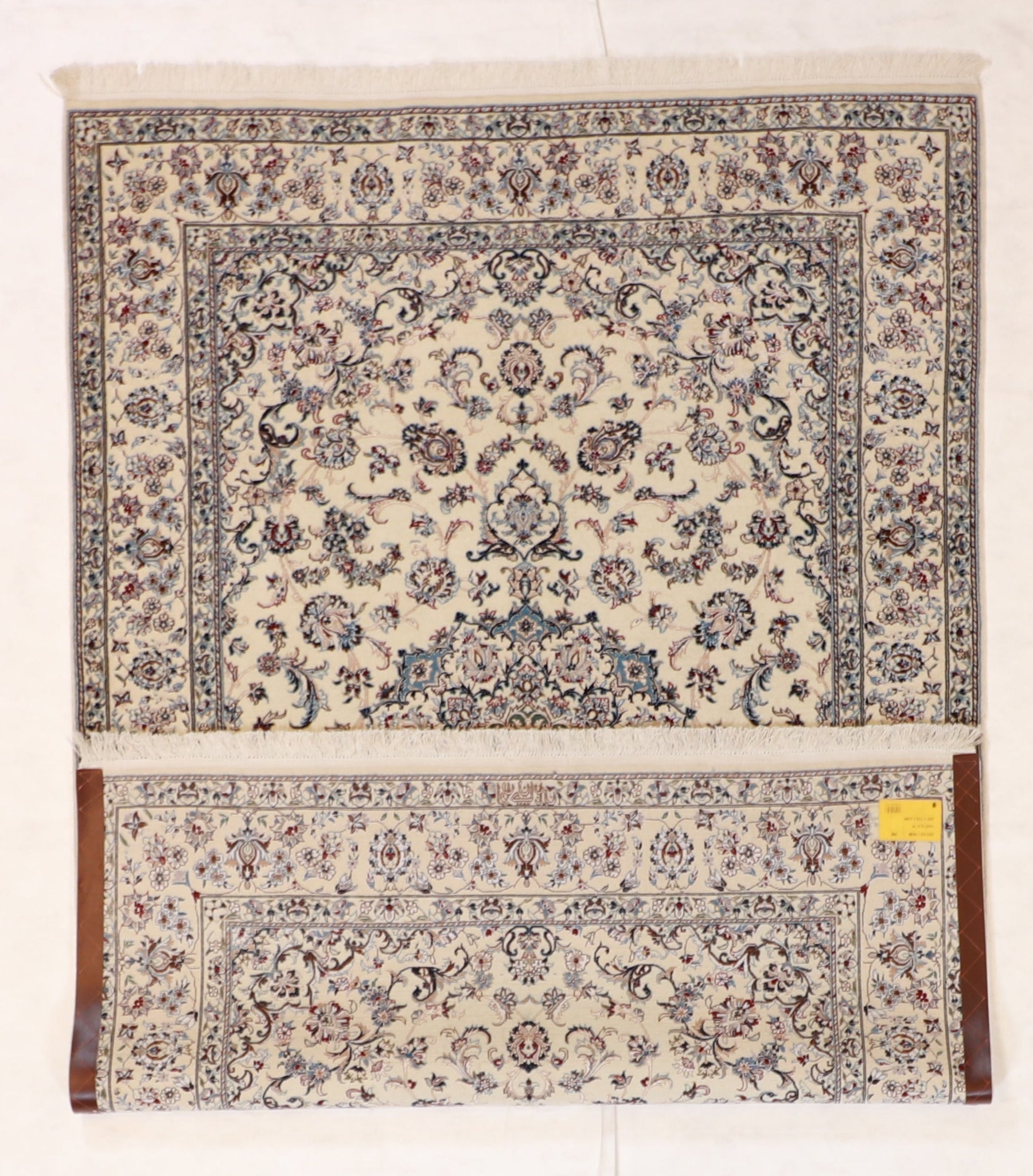 Introducing a magnificent Naine rug from Persia, with an all-over design that will effortlessly elevate the aesthetics of any space. Available in Blue, White, Black, Maroon, this rectangular rug measures 4.4x6.7 feet and has a thickness of 1/4 inches. Crafted with fine, wool and silk material, it offers a luxurious feel underfoot. Its pile construction ensures durability and longevity, while also making it easy to clean and maintain. This stunning rug covers an impressive area, providing a generous amount of coverage for your living room, bedroom, or office. Transform your space with this exquisite Persian masterpiece.