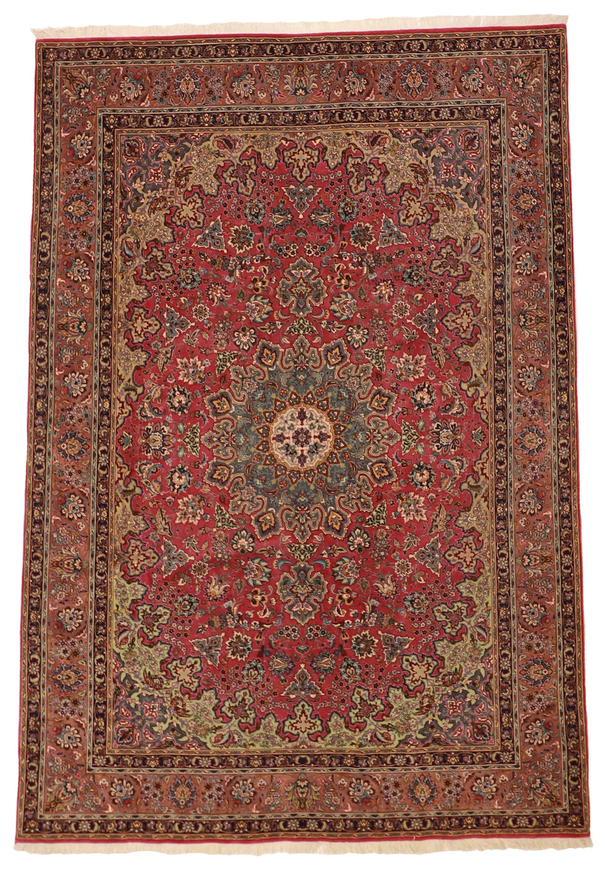 Introducing a stunning rug ideal for those seeking a touch of elegance and modernity in their space. This rectangular rug, originating from Persia, boasts a tabriz style with an eye-catching all-over design. Available in striking colors including Red, Green, Blue, Black, Beige, this rug adds warmth and vibrancy to any room. Made from fine/silk/wool material, it offers a plush and comfortable experience underfoot. With a size of 6.6x9.6, a thickness of 5/8 inches, this rug is perfect for larger spaces. Experience luxury and sophistication with this exquisite pile rug.