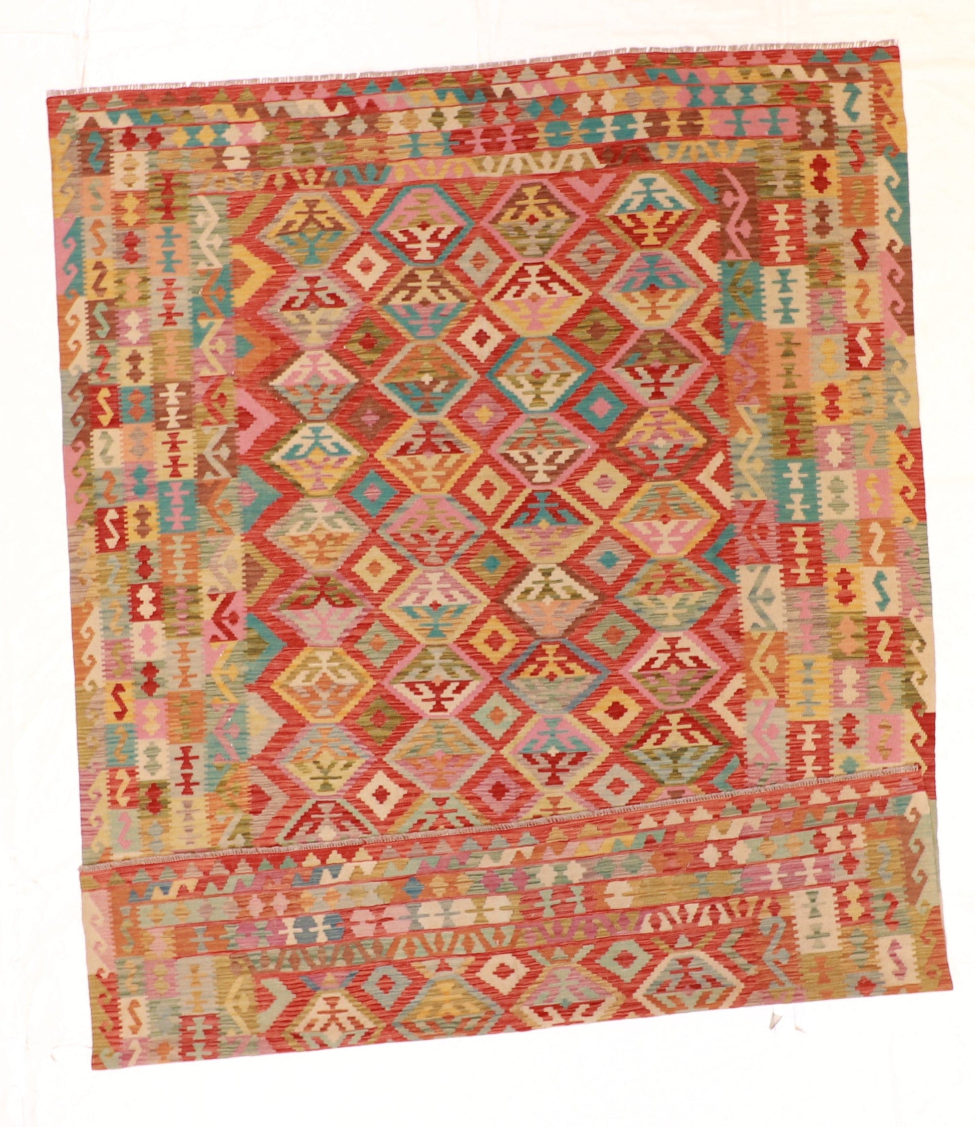 This exquisite 8.3x11.3 Kilim rug from Pakistan boasts a vibrant color palette, featuring shades of Teal, Red, Lilac, Brown, Green, Grey. Crafted with fine/wool, this rug showcases a traditional Kilim design that adds a touch of elegance and a timeless charm to any space. With a thickness of 3/8 inch, this rectangular rug offers durability and comfort underfoot. Its size covers an impressive area, making it suitable for larger rooms. The Flatweave construction further enhances its durability, making it a perfect addition for high-traffic areas. Embrace the beauty and craftsmanship of this Kilim rug in your home.
