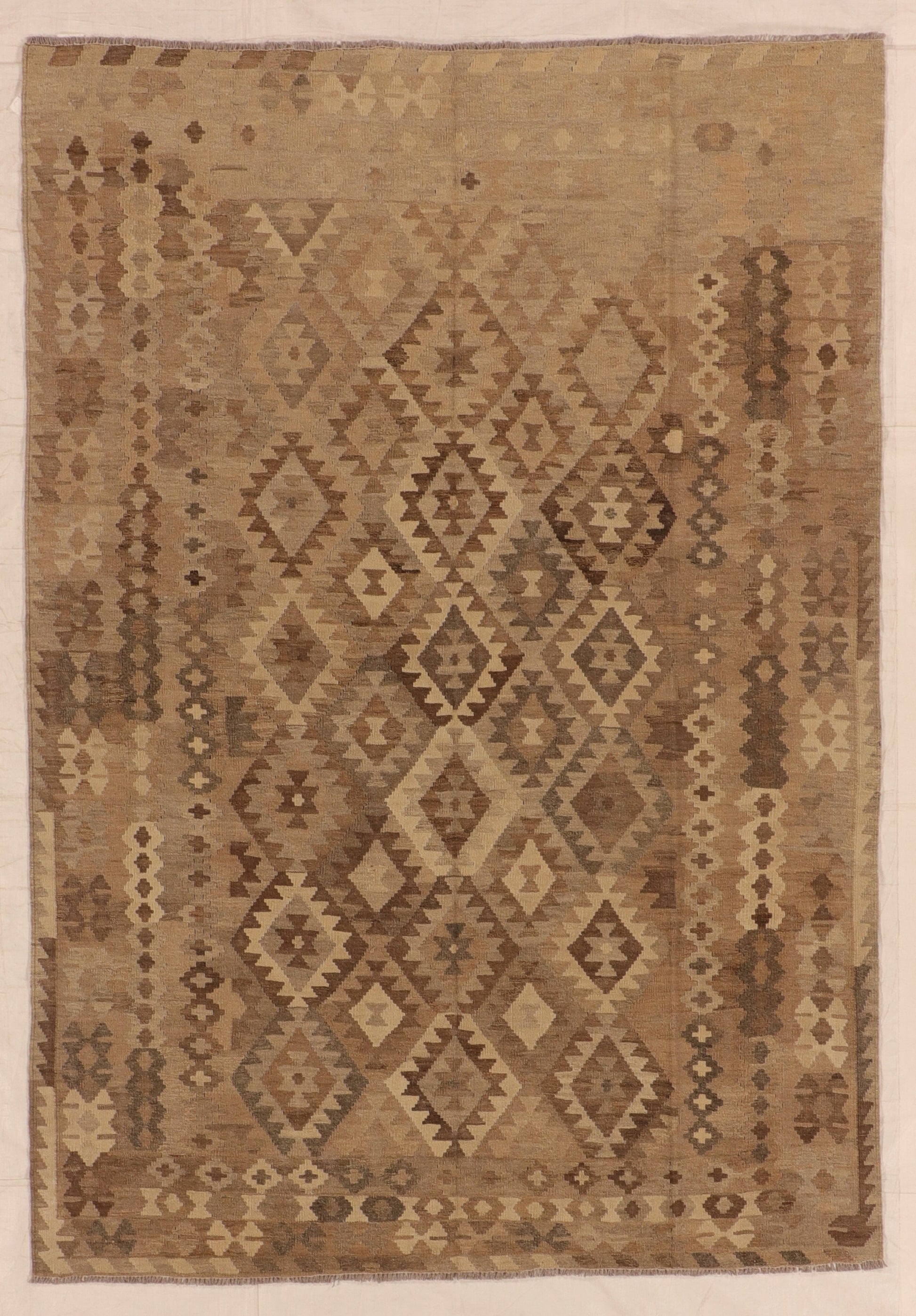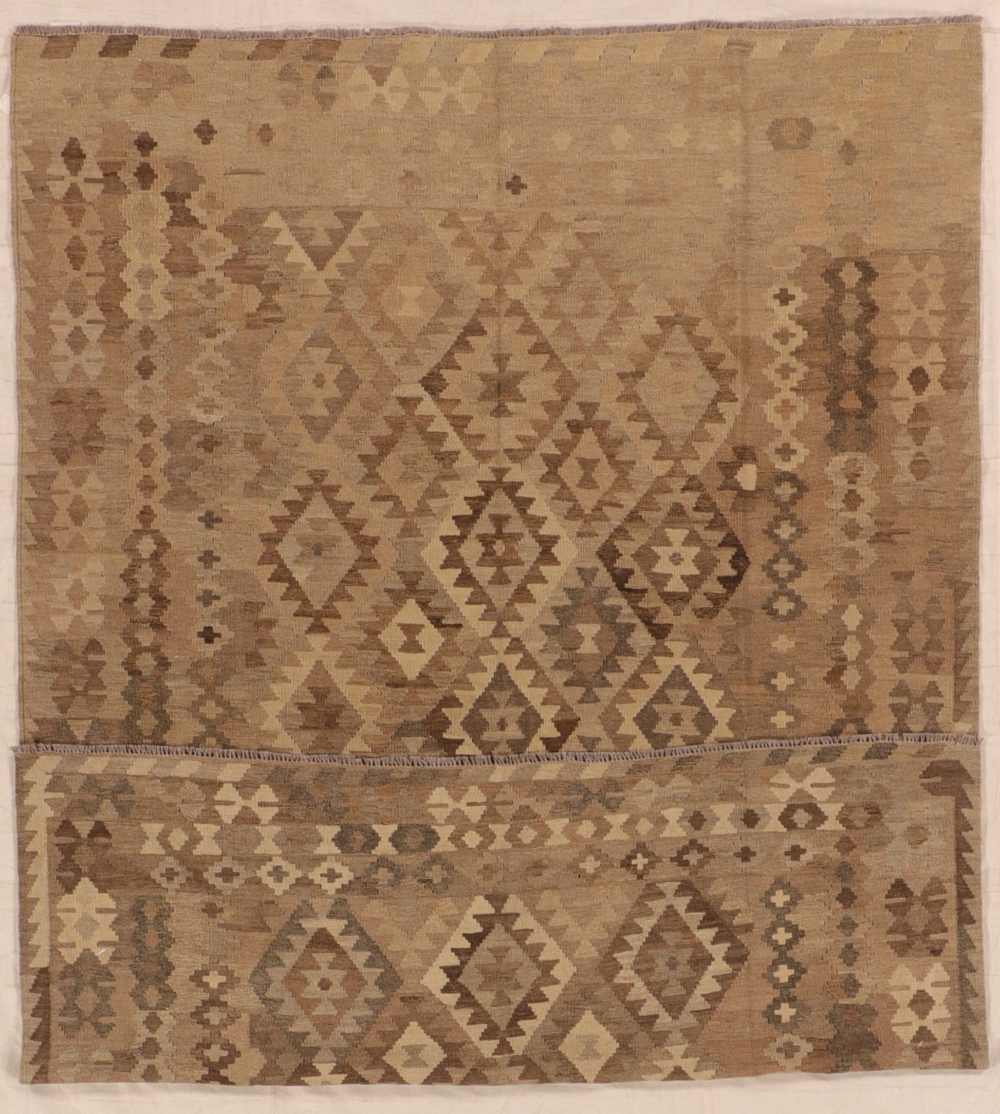 This exquisite 5.7x8 Kilim rug from Pakistan boasts a vibrant color palette, featuring shades of Beige, Brown. Crafted with Fine/Wool, this rug showcases a traditional Kilim design that adds a touch of elegance and a timeless charm to any space. With a thickness of 3/8 inch, this rectangular rug offers durability and comfort underfoot. Its size covers an impressive area, making it suitable for larger rooms. The Flatweave construction further enhances its durability, making it a perfect addition for high-traffic areas. Embrace the beauty and craftsmanship of this Kilim rug in your home.