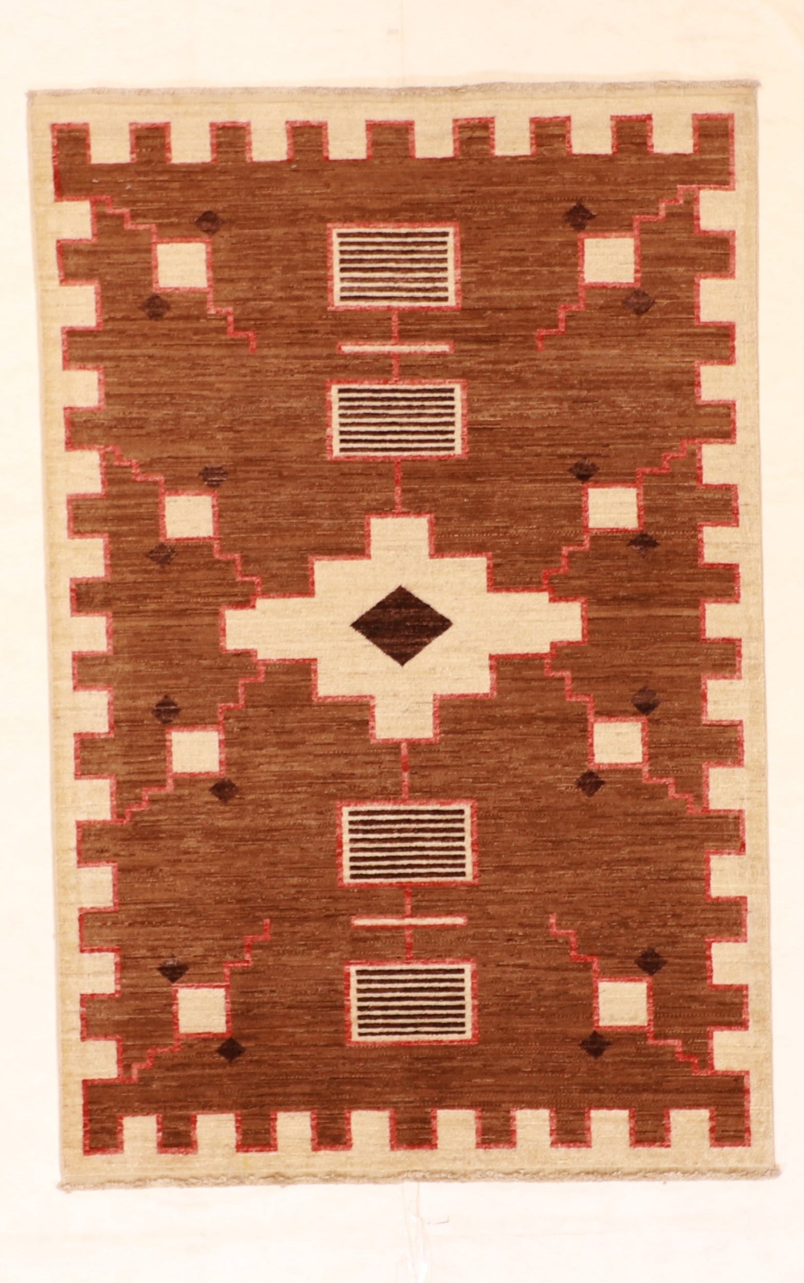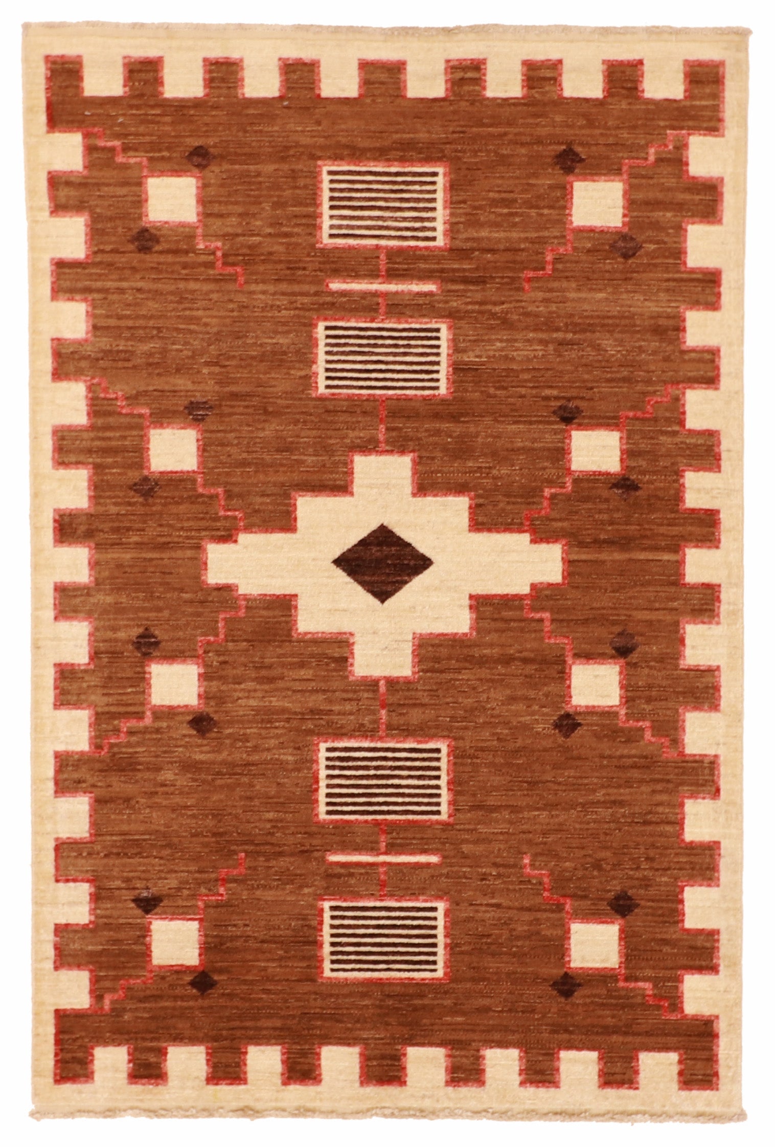 Introducing a stunning rug ideal for those seeking a touch of elegance and modernity in their space. This rectangular rug, originating from Pakistan, boasts a mountain modern style with an eye-catching all-over design. Available in striking colors including Brown, Rust, Beige, this rug adds warmth and vibrancy to any room. Made from fine wool material, it offers a plush and comfortable experience underfoot. With a size of 4x5.10, a thickness of 5/8 inches, this rug is perfect for larger spaces. Experience luxury and sophistication with this exquisite pile rug.