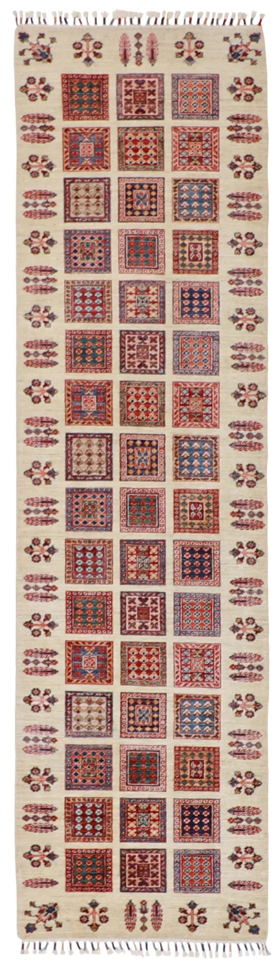 Introducing the stunning Bakhtiarie Wool Runner Rug from Pakistan. This exquisite rug boasts a captivating all-over design in beige, red, blue, rose, and green colors that will effortlessly complement any decor. Crafted with fine wool, the rug showcases a pile that measures 1/4 inch thick, ensuring durability and comfort. With its rectangular shape and dimensions of 2.8 feet in width and 9.9 feet in length, this runner rug covers an impressive area of floor space. Immerse your home in elegance with the timeless beauty of the Bakhtiarie Wool Runner Rug.
