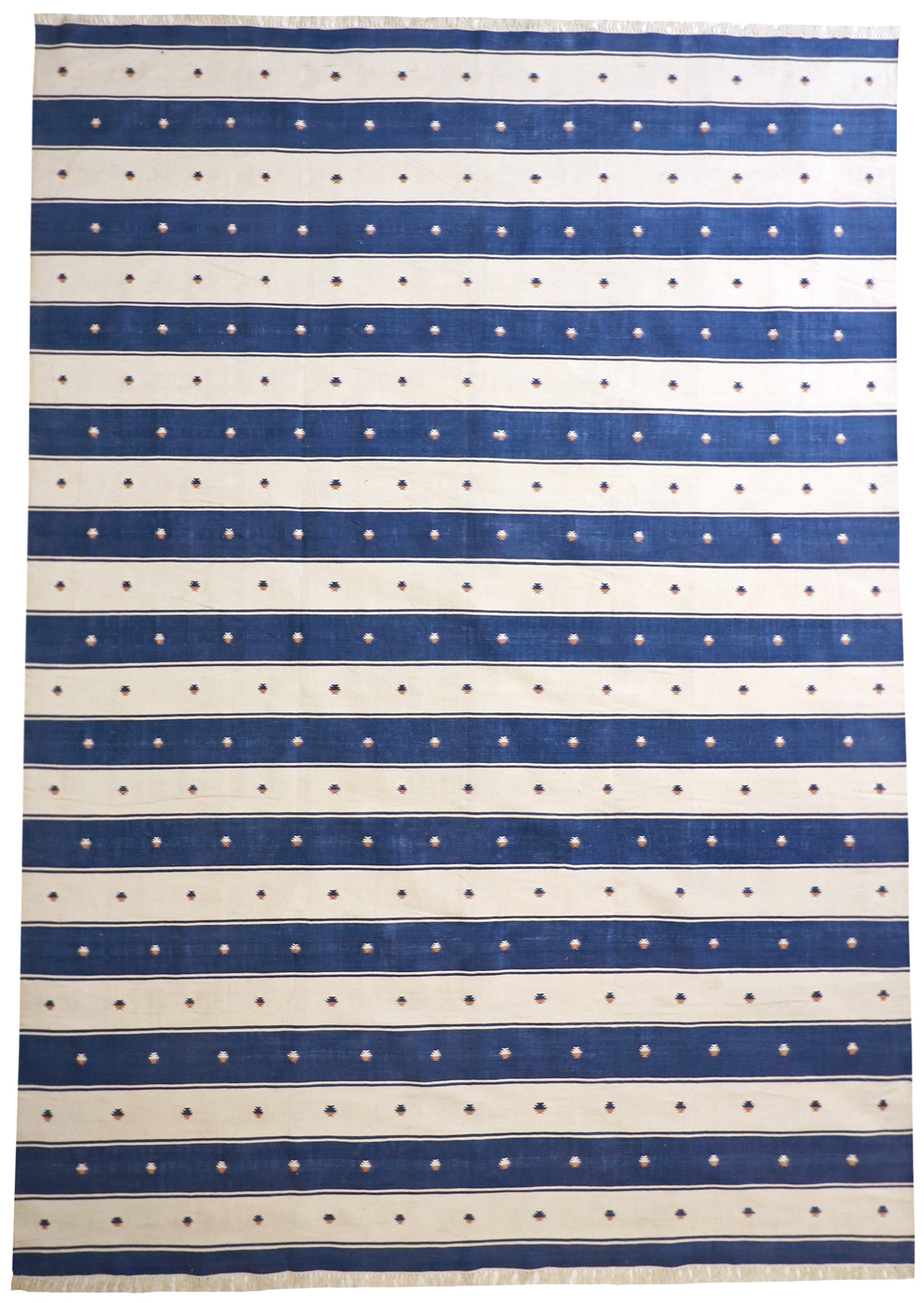 Introducing our stunning Kilim rug from India. This eye-catching rug features an all-over design in a range of vibrant colors including Ivory, Blue, Brown. Crafted with care, this fine wool material rug is perfect for adding warmth and style to any room. The rectangular shape and dimensions of 8.10' width and 12' length make it an ideal fit for various spaces. With a thickness of 1/4", this flatweave rug is both durable and comfortable underfoot. Its generous size ensures ample coverage. Bring a touch of elegance and cultural charm to your home with this exquisite Kilim rug.
