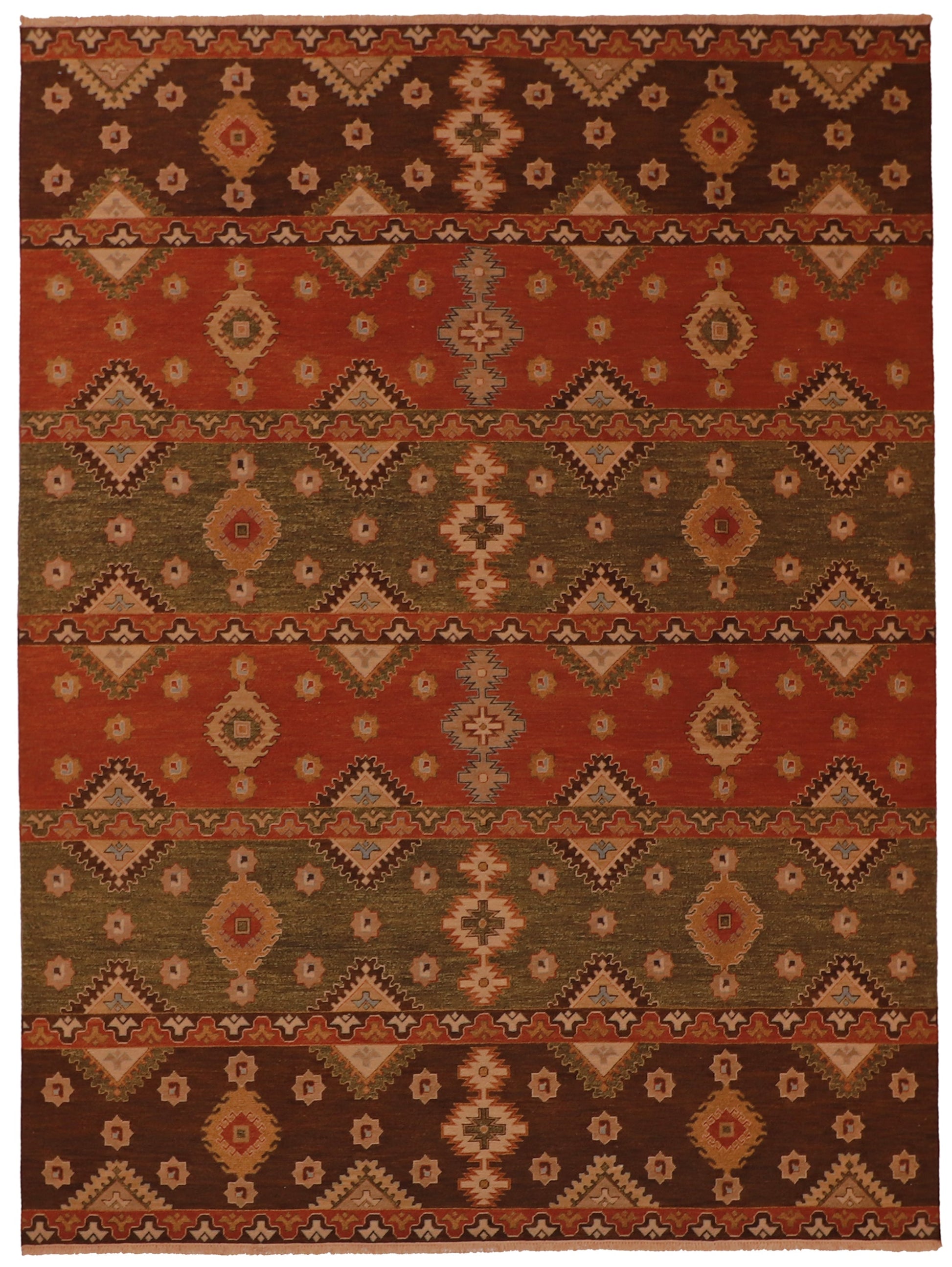 Introducing an exquisite Serapie rug crafted in India, perfect for adding a touch of elegance to any space. This beautiful rectangle rug measures 9x12 feet, offering a generous size to effortlessly transform your room. Its all-over design features a sophisticated combination of Brown, Red, Green tones, creating a stunning visual appeal. The rug is made of fine wool, ensuring durability and a luxurious feel underfoot. With a thickness of 1/4 inch, this rug is not only stylish but also practical for high traffic areas. Enhance your home with this timeless and versatile masterpiece.