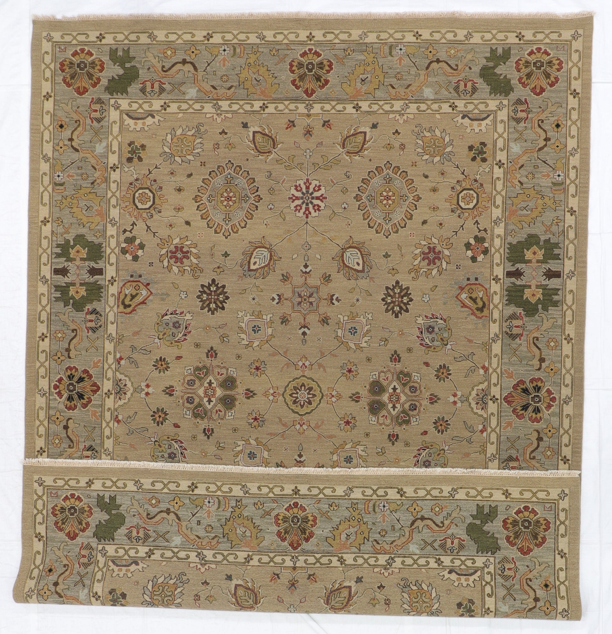 Introducing our exquisite Mahal rug, showcasing a stunning all-over design in a variety of captivating colors including Tan, Brown, Green, Grey, Red. Handcrafted in India, this rectangular rug measures 9 x 12 and features a fine wool pile with a thickness of 5/8 inch. With a width of 9 and a length of 12, it covers an impressive area, making it ideal for larger areas. Crafted with attention to detail, this rug combines traditional craftsmanship with modern style, creating a timeless and elegant addition to any home décor. Add warmth and character to your space with this finest quality rug.
