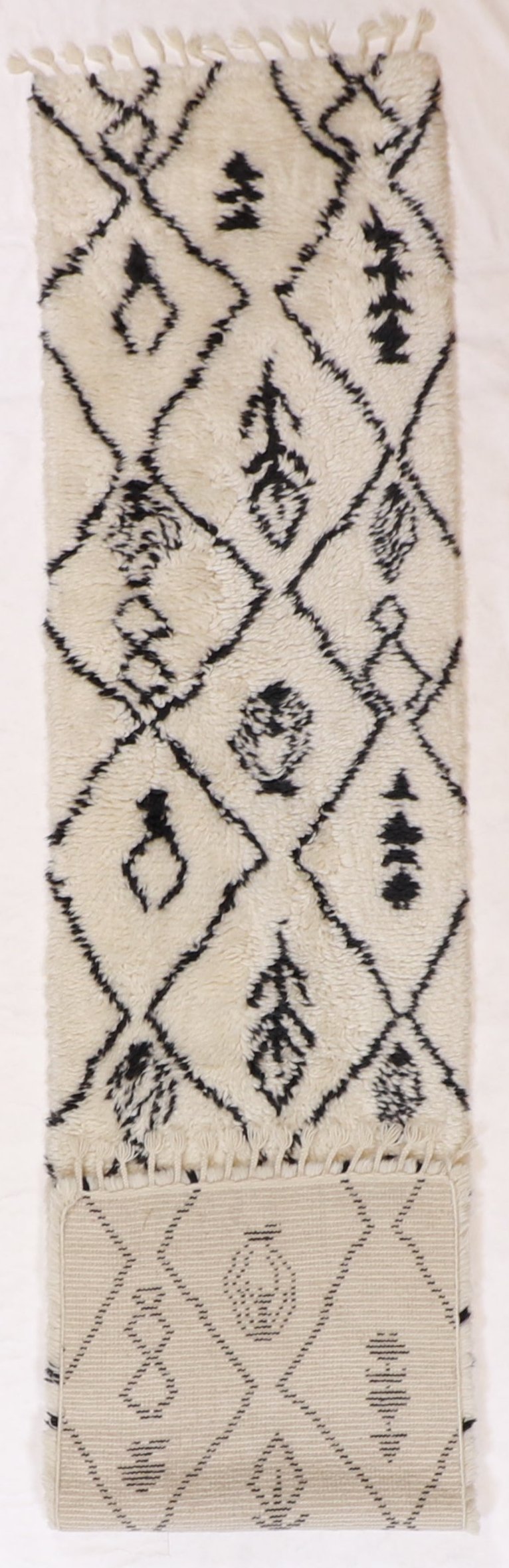 Introducing our exquisite Moroccan-style runner rug, designed with an all-over pattern that adds a touch of elegance to any space. Available in two versatile colors, White, Black this rug is perfect for complementing various interior designs. It is skillfully crafted in India using only the finest materials, ensuring quality and durability. The rectangular shape and pile construction make it ideal for high-traffic areas. With a thickness of 1/4 inch, this rug adds a layer of comfort without overwhelming the room. Measuring 2.7 ft in width and 11.10 ft in length, making it a perfect choice for adding warmth and style to your home.