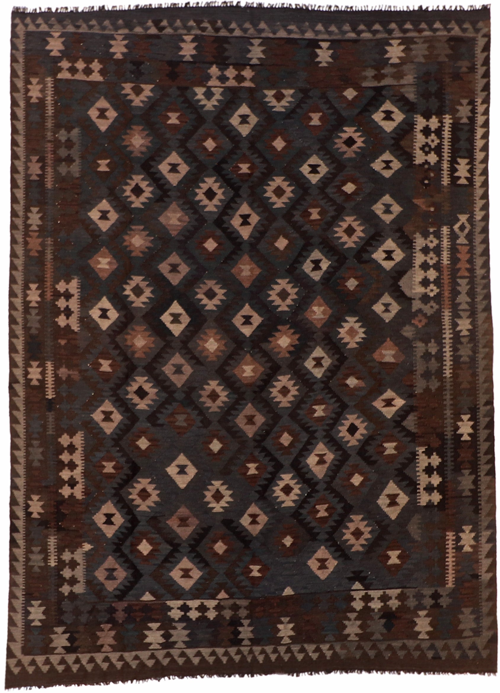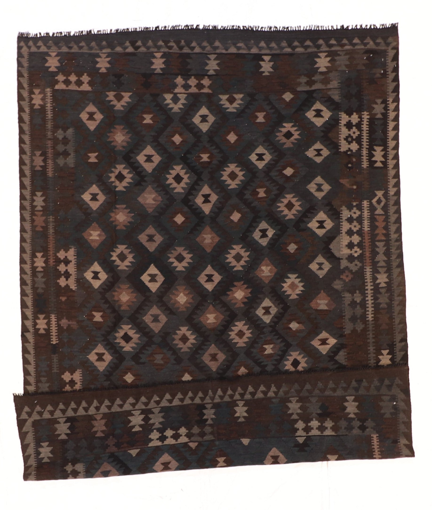 This exquisite 7x9.6 Kilim rug from Pakistan boasts a vibrant color palette, featuring shades of Black, Brown, Grey. Crafted with wool, this rug showcases a traditional Kilim design that adds a touch of elegance and a timeless charm to any space. With a thickness of 3/8 inch, this rectangular rug offers durability and comfort underfoot. Its size covers an impressive area, making it suitable for larger rooms. The Flatweave construction further enhances its durability, making it a perfect addition for high-traffic areas. Embrace the beauty and craftsmanship of this Kilim rug in your home.