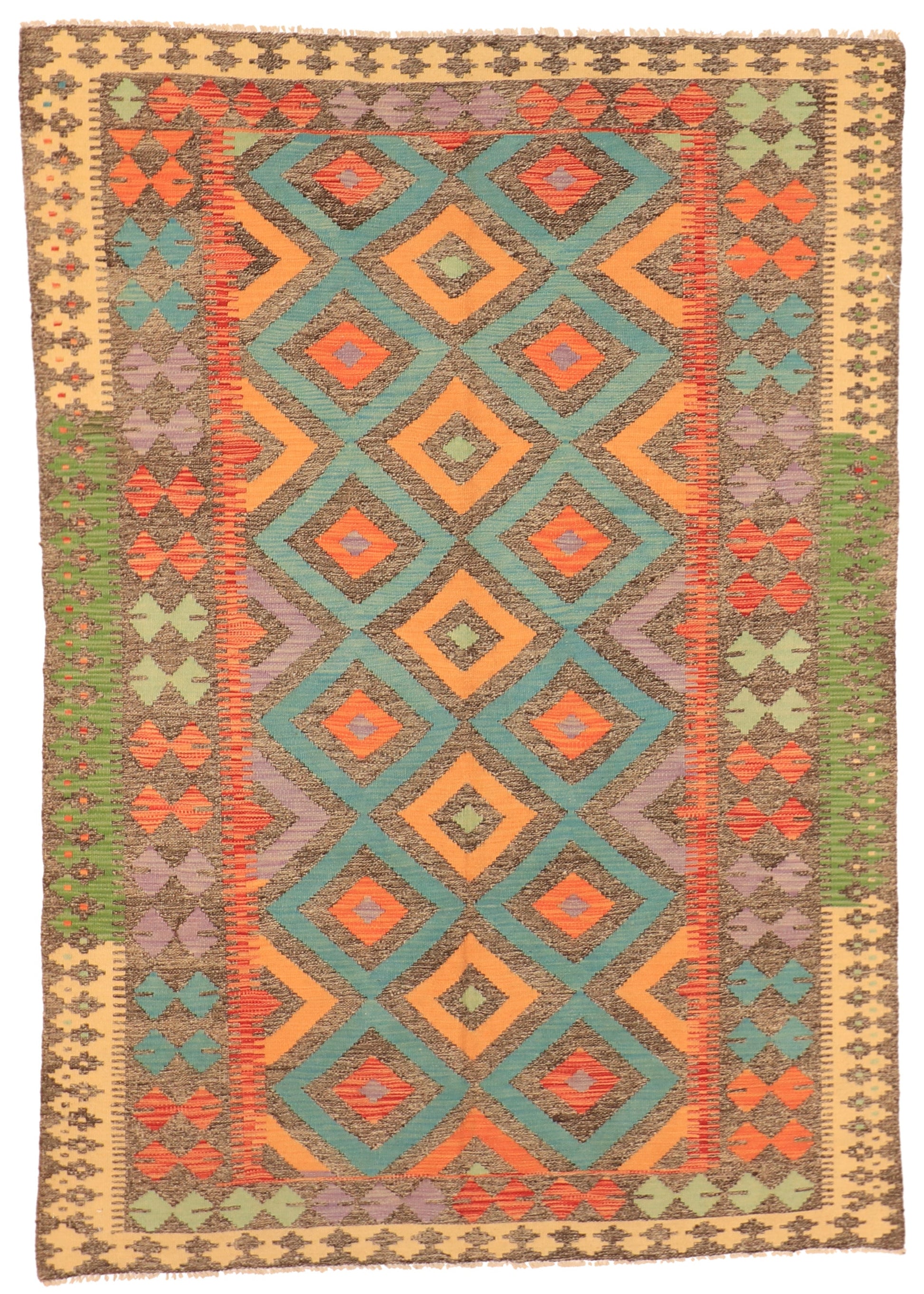 This exquisite 5.5x7.10 Kilim rug from Pakistan boasts a vibrant color palette, featuring shades of Orange, Red, Teal, Blue, Beige. Crafted with Fine/Wool, this rug showcases a traditional Kilim design that adds a touch of elegance and a timeless charm to any space. With a thickness of 3/8 inch, this rectangular rug offers durability and comfort underfoot. Its size covers an impressive area, making it suitable for larger rooms. The Flatweave construction further enhances its durability, making it a perfect addition for high-traffic areas. Embrace the beauty and craftsmanship of this Kilim rug in your home.