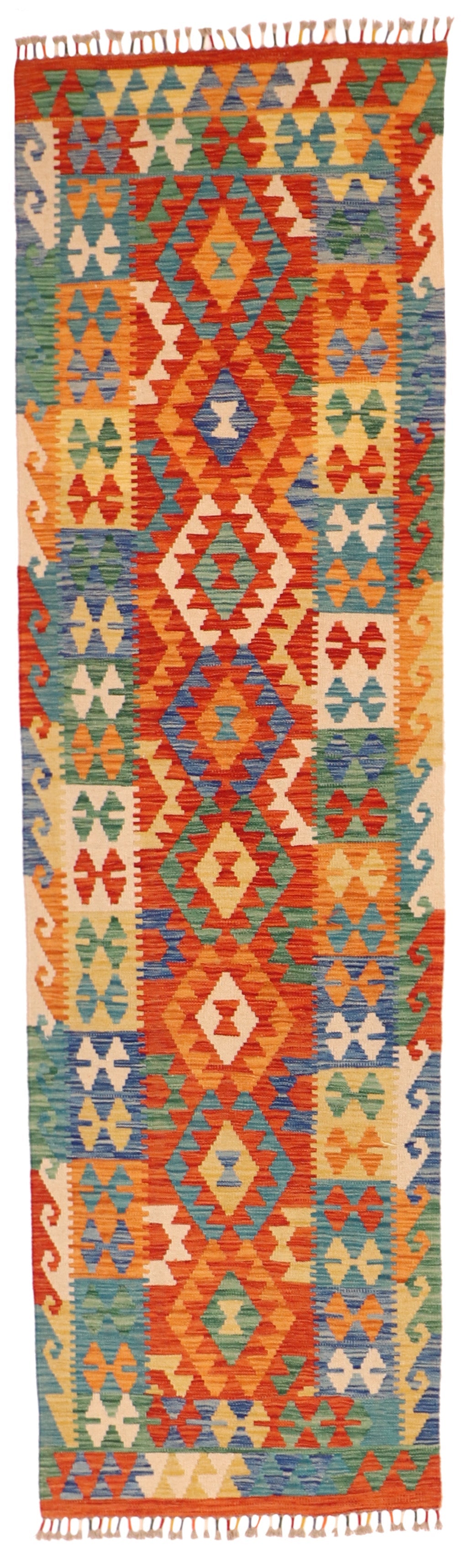 This exquisite 2.10x9.8 Kilim rug from Pakistan boasts a vibrant color palette, featuring shades of Red, Yellow, Blue, White, Orange, Green. Crafted with fine/wool, this rug showcases a traditional Kilim design that adds a touch of elegance and a timeless charm to any space. With a thickness of 3/8 inch, this rectangular rug offers durability and comfort underfoot. Its size covers an impressive area, making it suitable for larger rooms. The Flatweave construction further enhances its durability, making it a perfect addition for high-traffic areas. Embrace the beauty and craftsmanship of this Kilim rug in your home.