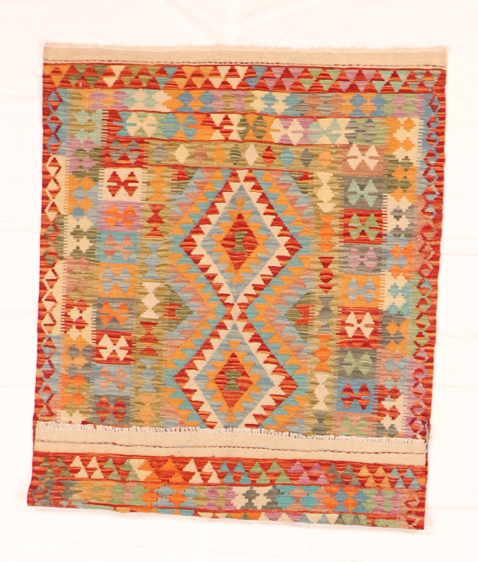 Introducing the exquisite Kilim Geometric Rug from Pakistan. This stunning rug boasts a vibrant color palette, featuring shades of Beige, Brown, Red, Tan, Blue, Green which beautifully complement its geometric design. Made from fine wool materials, it showcases a pile texture that adds to its timeless appeal. Whether adorned in a living room, bedroom, or any space you desire, this Kilim Rug is sure to enhance the style and elegance of any interior decor.
