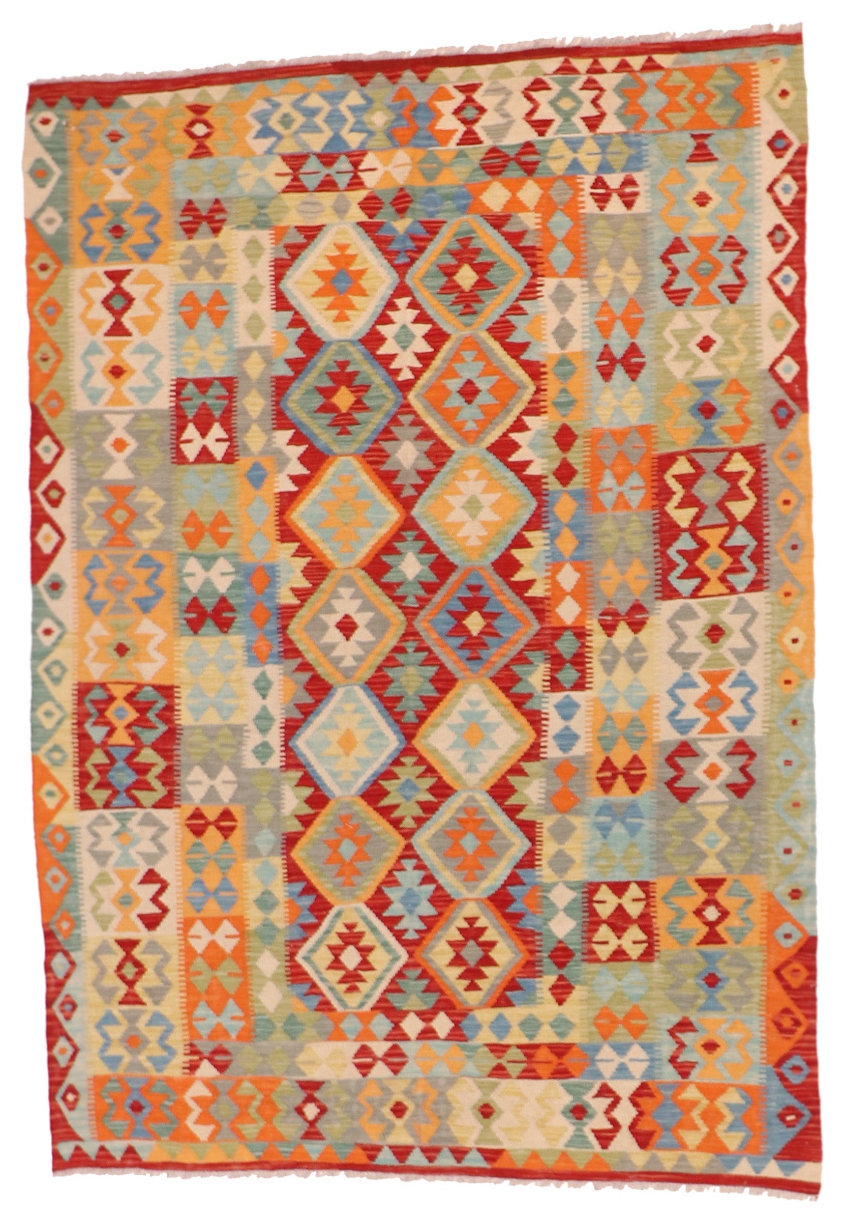 This exquisite 5.9x8 Kilim rug from Pakistan boasts a vibrant color palette, featuring shades of Red, Orange, Blue, Green. Crafted with fine/wool, this rug showcases a traditional Kilim design that adds a touch of elegance and a timeless charm to any space. With a thickness of 3/8 inch, this rectangular rug offers durability and comfort underfoot. Its size covers an impressive area, making it suitable for larger rooms. The Flatweave construction further enhances its durability, making it a perfect addition for high-traffic areas. Embrace the beauty and craftsmanship of this Kilim rug in your home.