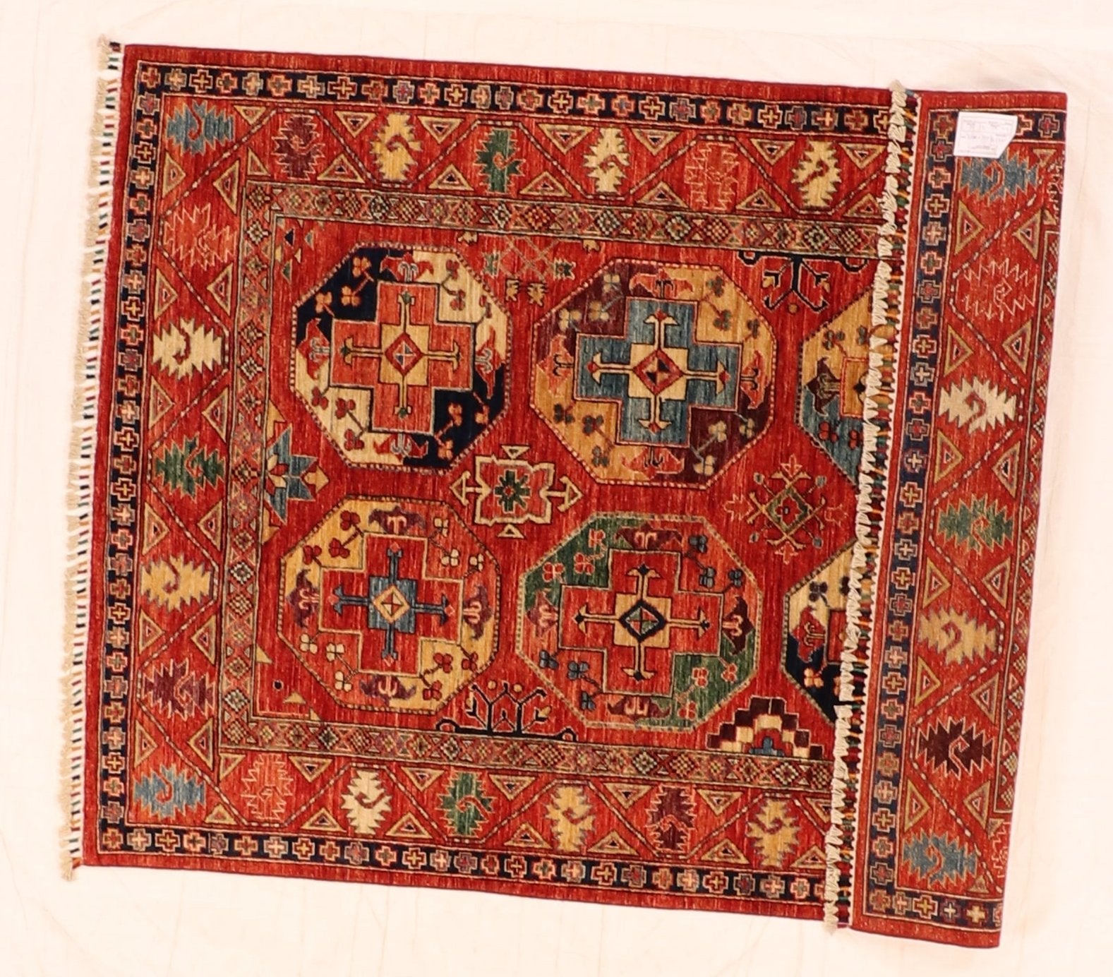 Introducing a stunning Tekeh style runner rug from Pakistan. This exquisite rug features a geometric design in vibrant shades of Red, Tan, Beige, Black, Green, Blue. Crafted with fine materials, this pile rug is both stylish and durable. Its rectangular shape and runner size make it ideal for hallways or entryways. With a thickness of 1/4 inch, it adds a touch of elegance to any space. With dimensions of 5 feet in width and 6.8 feet in length, it covers an impressive area. Elevate your home decor with this beautiful and versatile rug.