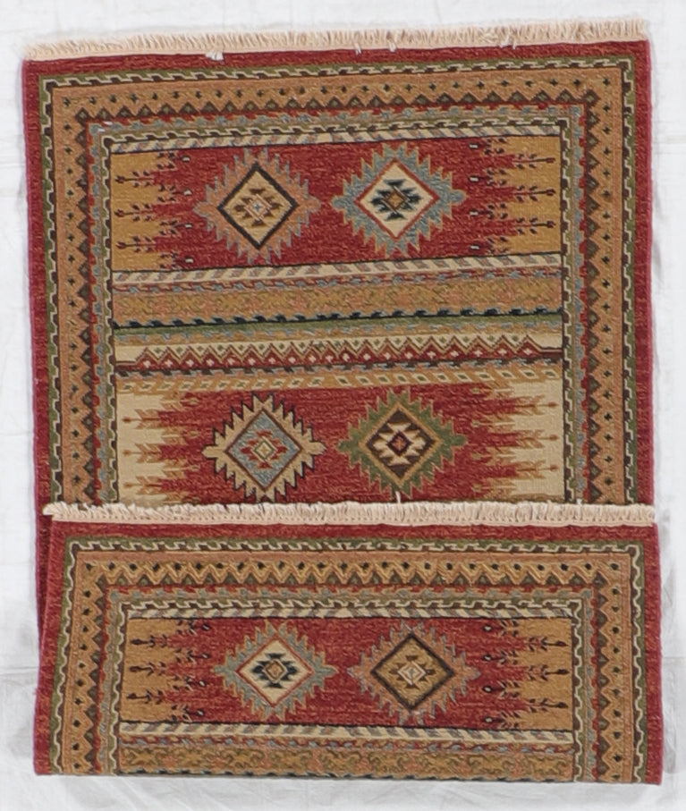 Introducing the Karageh Geometric Rug from India, a perfect addition to your home decor. With its vibrant colors of red, green, brown, and orange, this rug will instantly add a touch of elegance and style to any room. Crafted from fine wool, it offers both durability and softness underfoot. The geometric design creates a modern and sophisticated look, while the pile construction adds a unique texture. Measuring 2.11x4.10 feet and with a thickness of 3/8 inch, this rectangle-shaped rug covers an impressive area. Enhance your living space with this beautiful Karageh Geometric Rug.