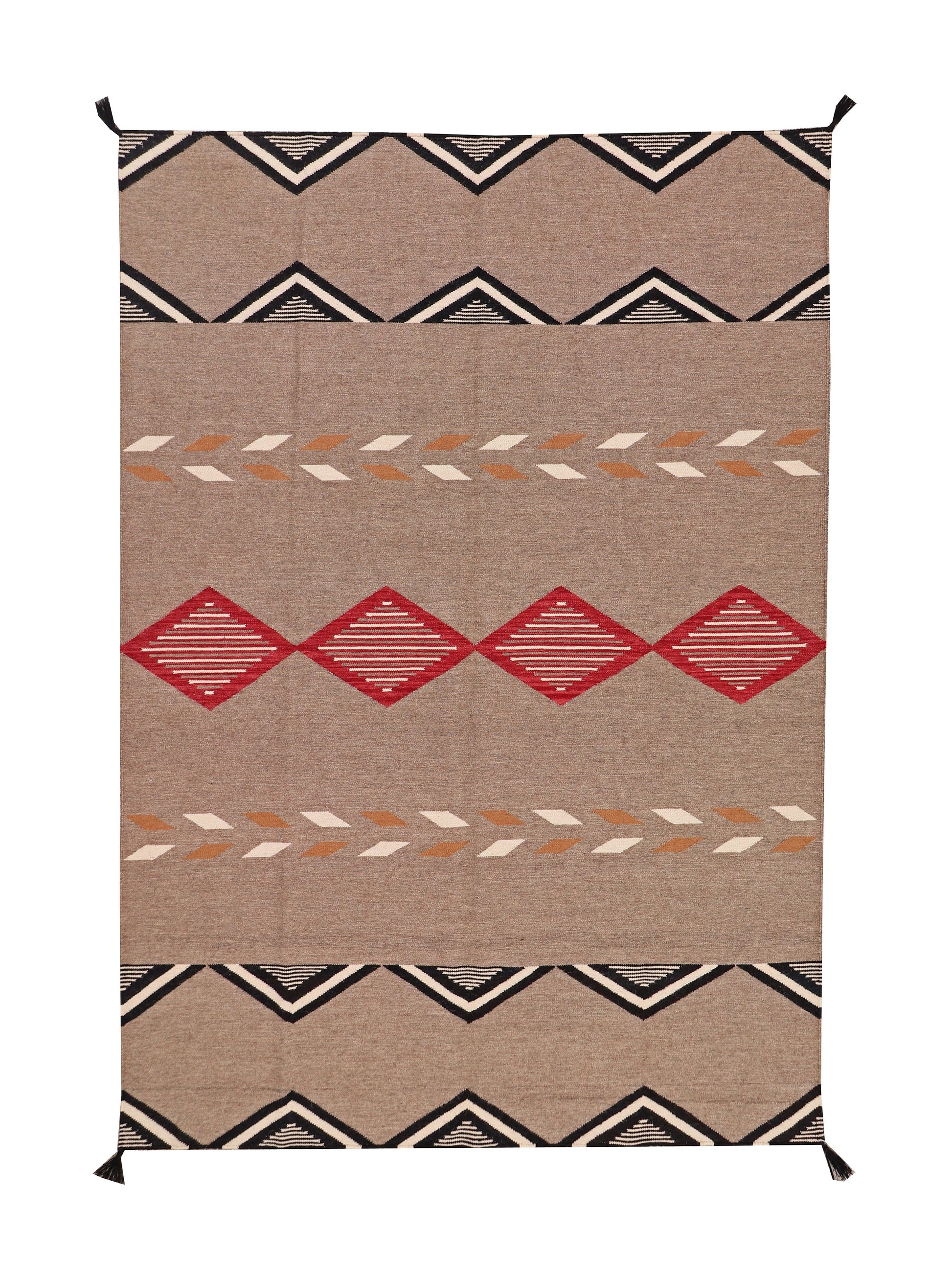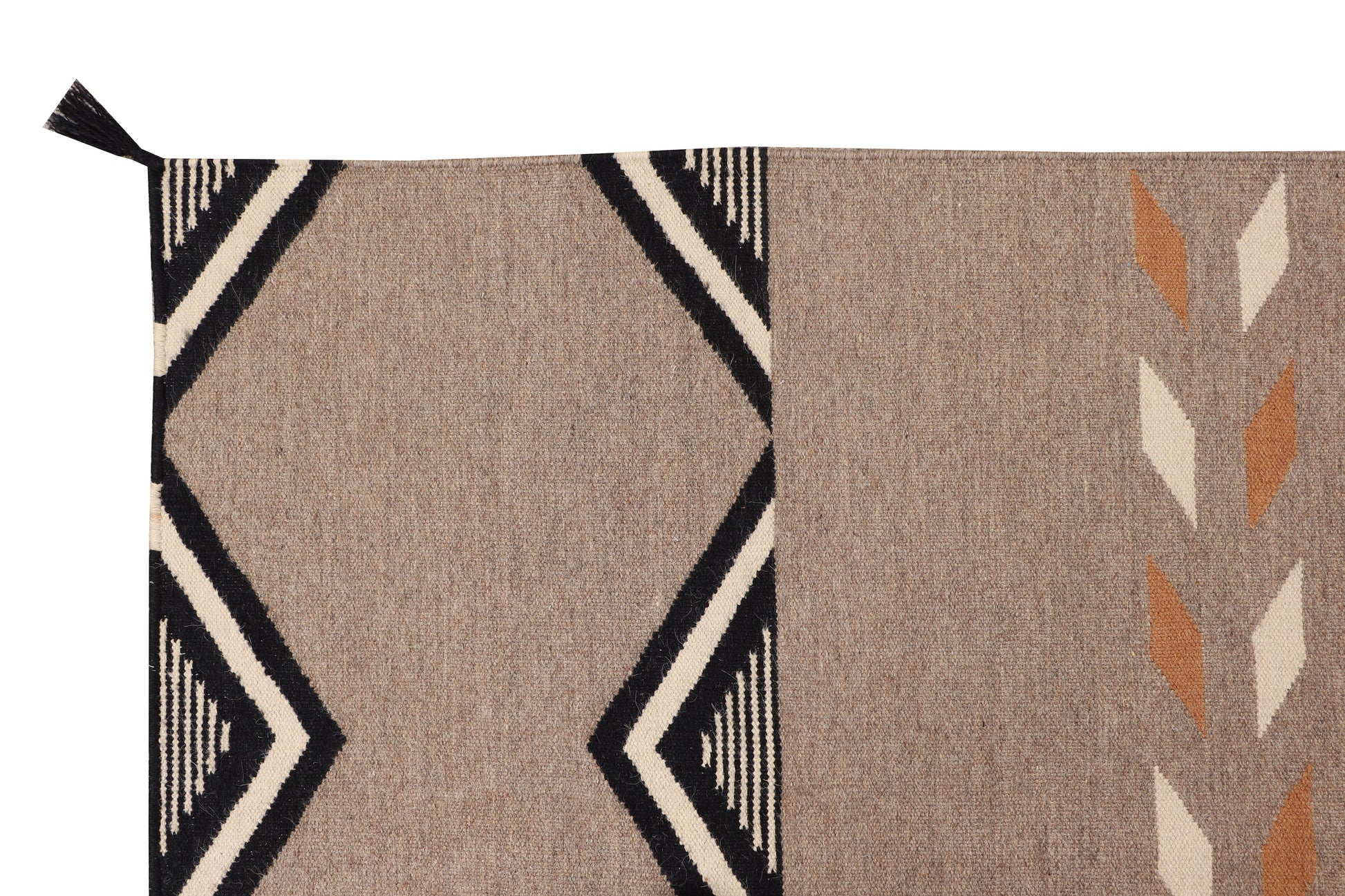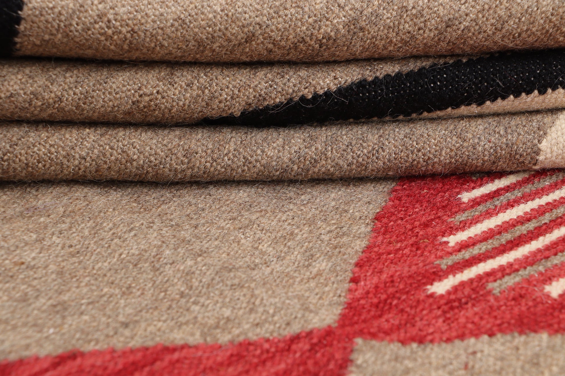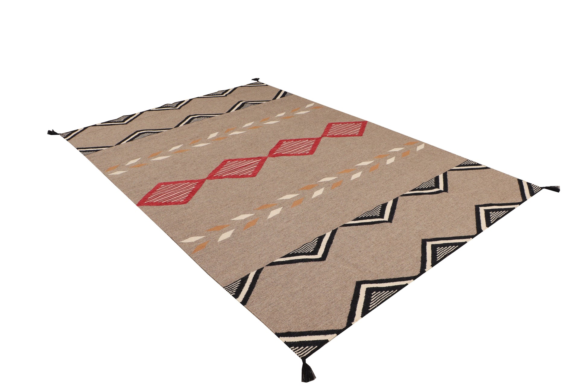 Introducing a stunning Modern-style rug from Pakistan. This exquisite rug features a geometric design of Grey, Black, Beige, Red, adding warmth and character to any space. Crafted with fine materials and a flatweave, this rug is not only visually pleasing but also durable and easy to maintain.