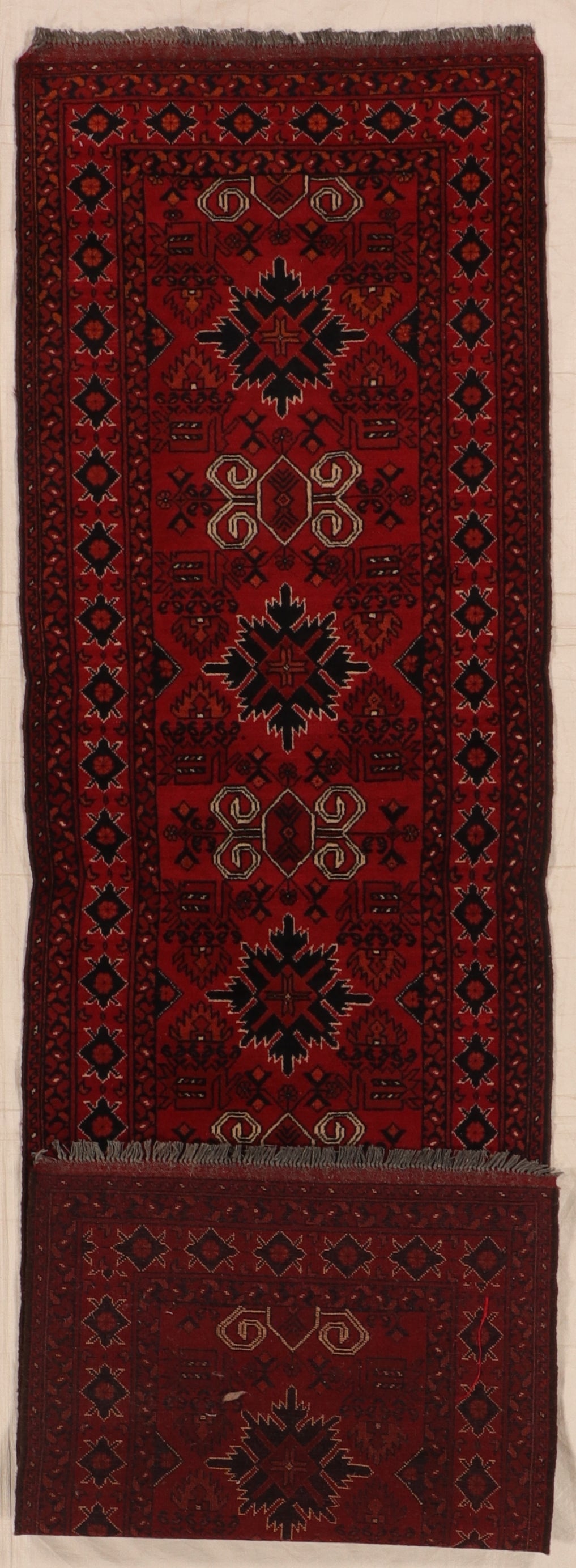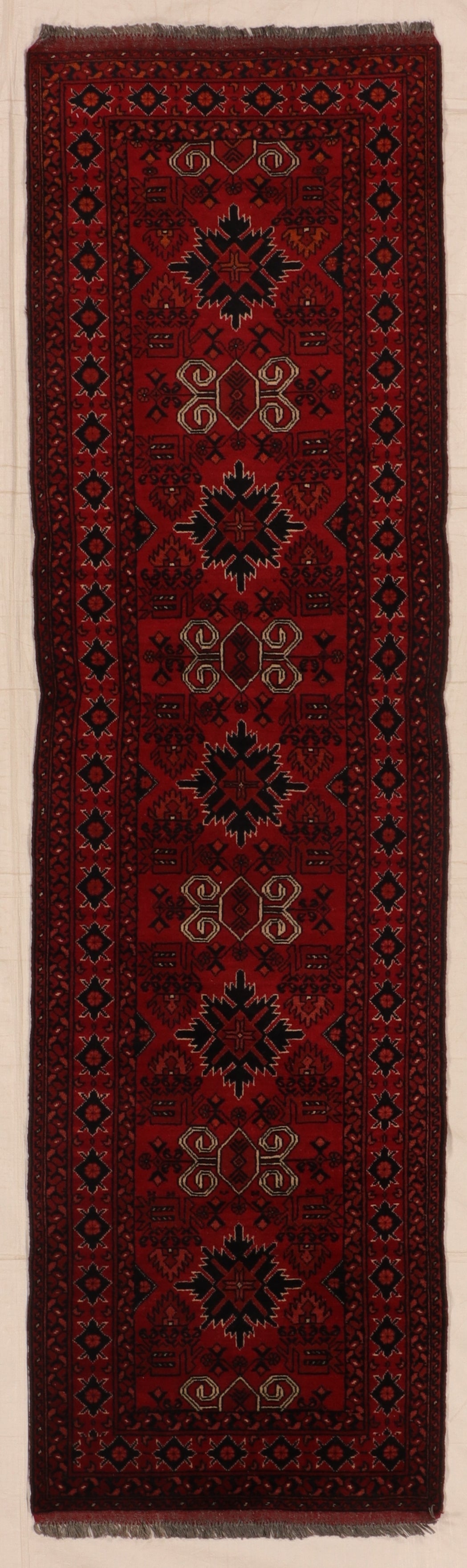 Introducing the exquisite Khan Mohamadie rug from Afghanistan. This stunning work of art is designed with an all-over pattern, featuring vibrant colors such as Maroon, Black, Beige. Crafted with fine materials, this rug showcases a pile construction, adding a touch of elegance to any space. With a rectangular shape and a size of 2.8x9.5 feet, it covers an impressive area. The rug's thin profile of 1/4 inch enhances its versatility and makes it suitable for a range of settings. Experience the rich heritage and impeccable craftsmanship of this Afghan masterpiece.