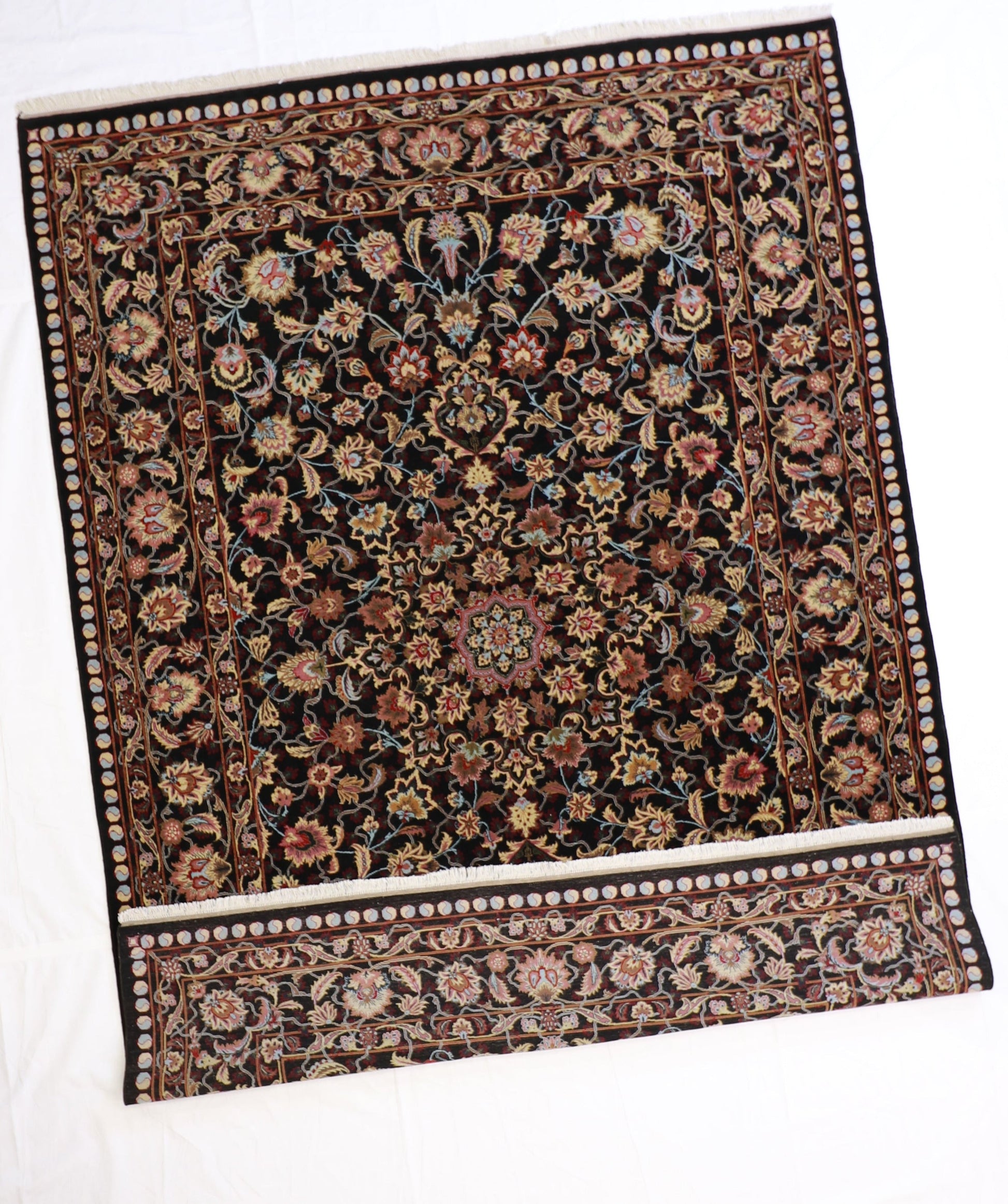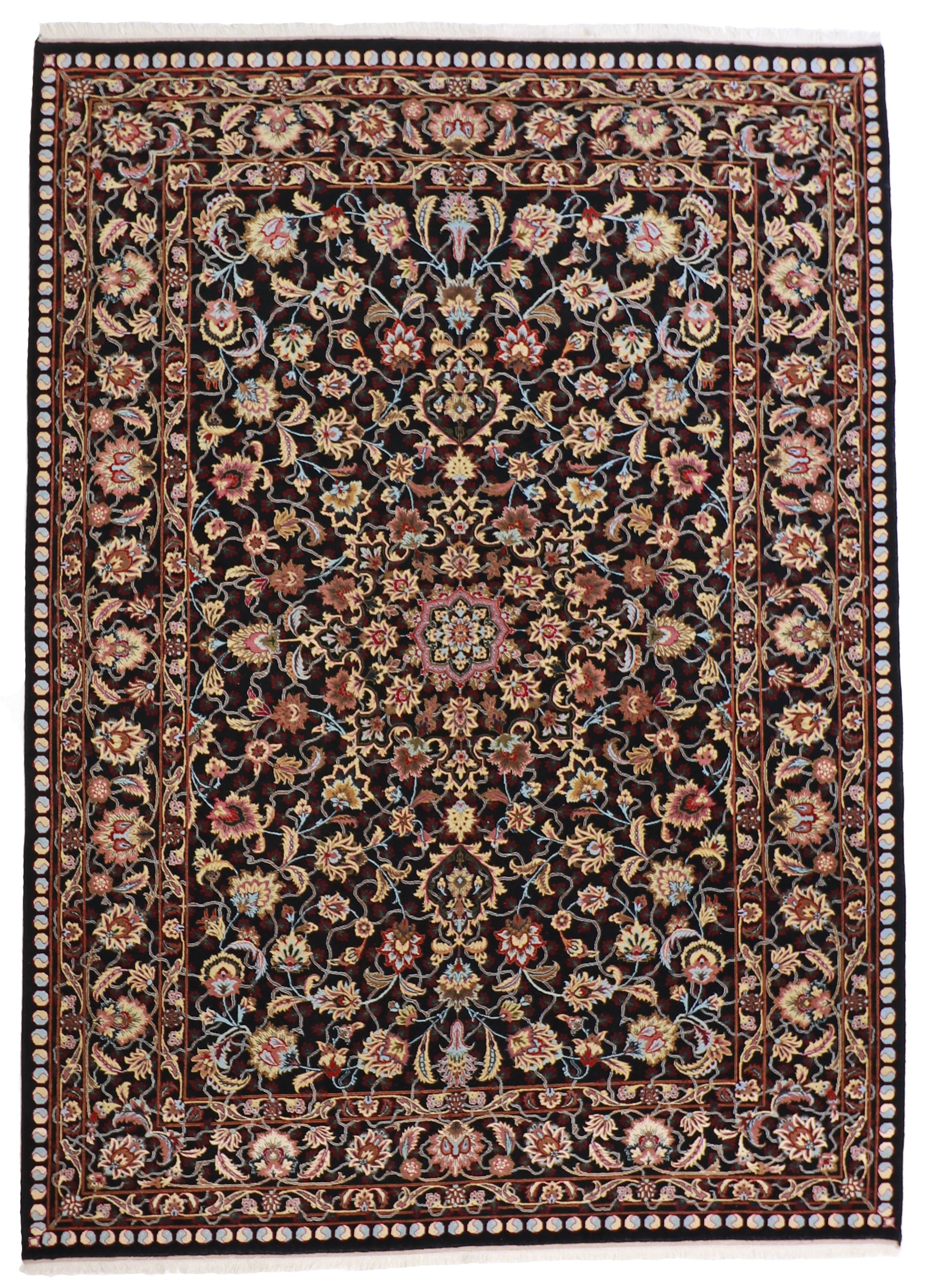 Introducing our exquisite Persian Mashad rug, a true work of art for your living space. Crafted with meticulous attention to detail, this rug embodies beauty and elegance. Its vibrant colors, including Black, Cream, Blue, Rose, complement the intricate all over design, adding a touch of nature to your home. Measuring 8.2x11.3 feet with a thickness of 5/8 inches, the rectangular shape fits perfectly in any room. Made from luxurious silk, this rug has a soft and smooth texture that feels delightful underfoot. With a pile weave, it offers both plushness and durability. Bring home this timeless Persian masterpiece to elevate your decor.