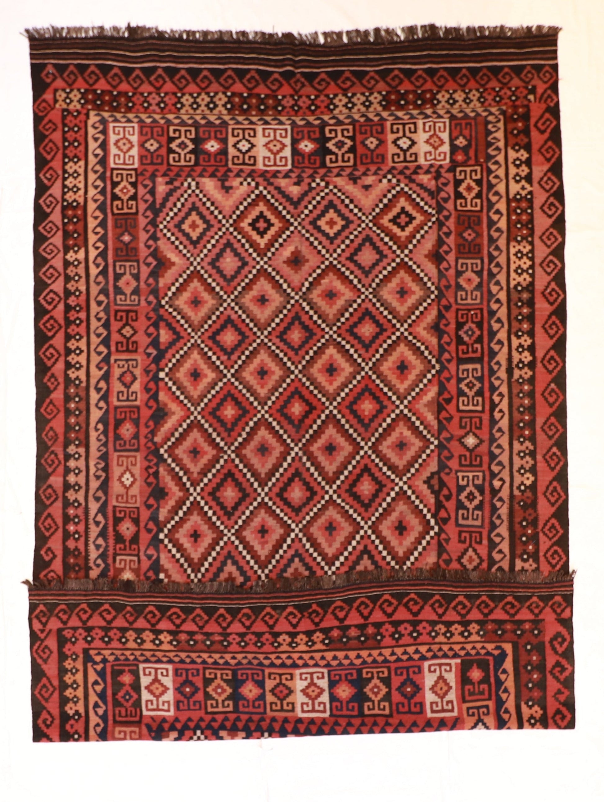 This exquisite 8.3x13.2 Kilim rug from Afghanistan boasts a vibrant color palette, featuring shades of Red, Black, Navy, Beige, Lilac. Crafted with wool, this rug showcases a traditional Kilim design that adds a touch of elegance and a timeless charm to any space. With a thickness of 3/8 inch, this rectangular rug offers durability and comfort underfoot. Its size covers an impressive area, making it suitable for larger rooms. The Flatweave construction further enhances its durability, making it a perfect addition for high-traffic areas. Embrace the beauty and craftsmanship of this Kilim rug in your home.