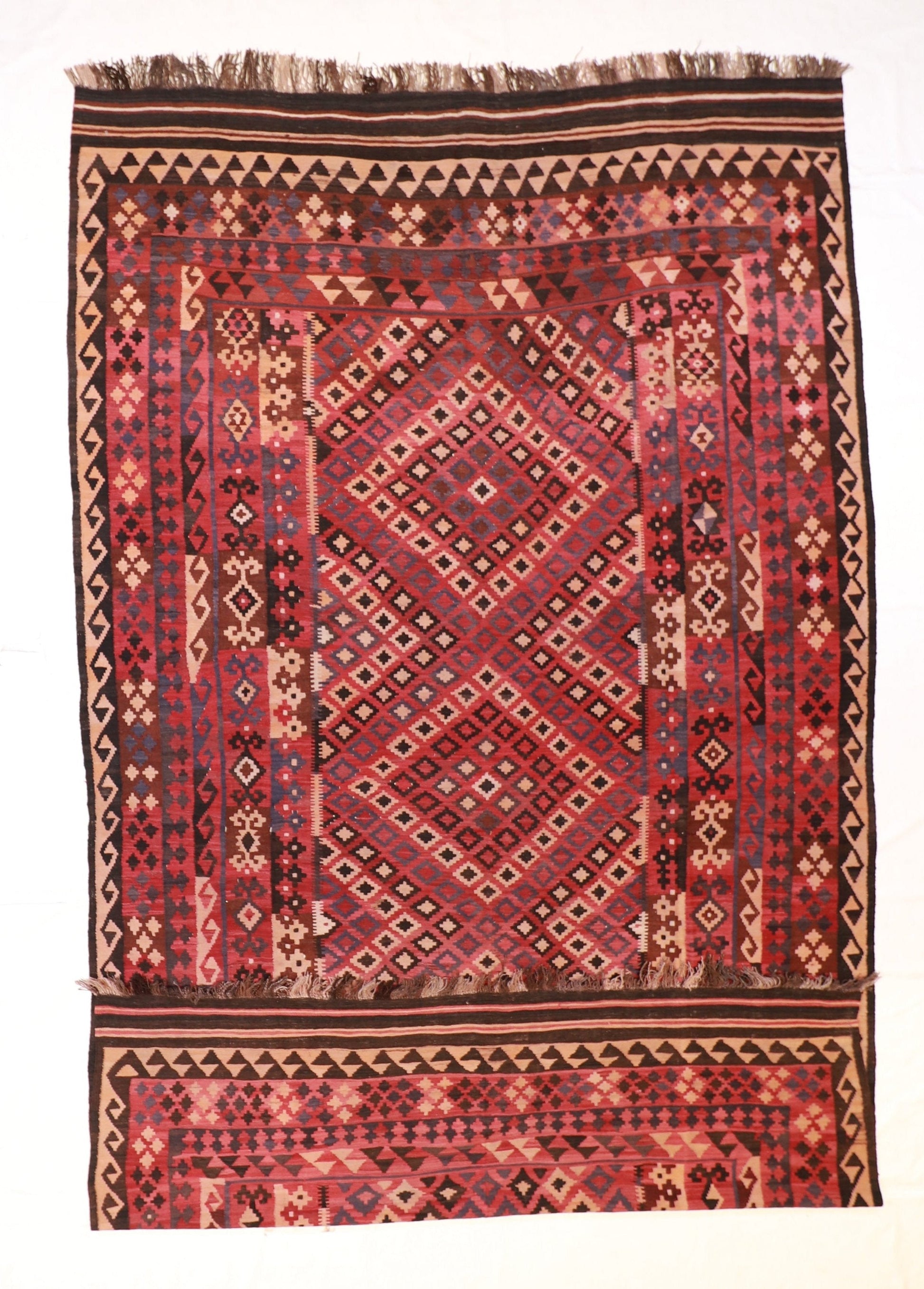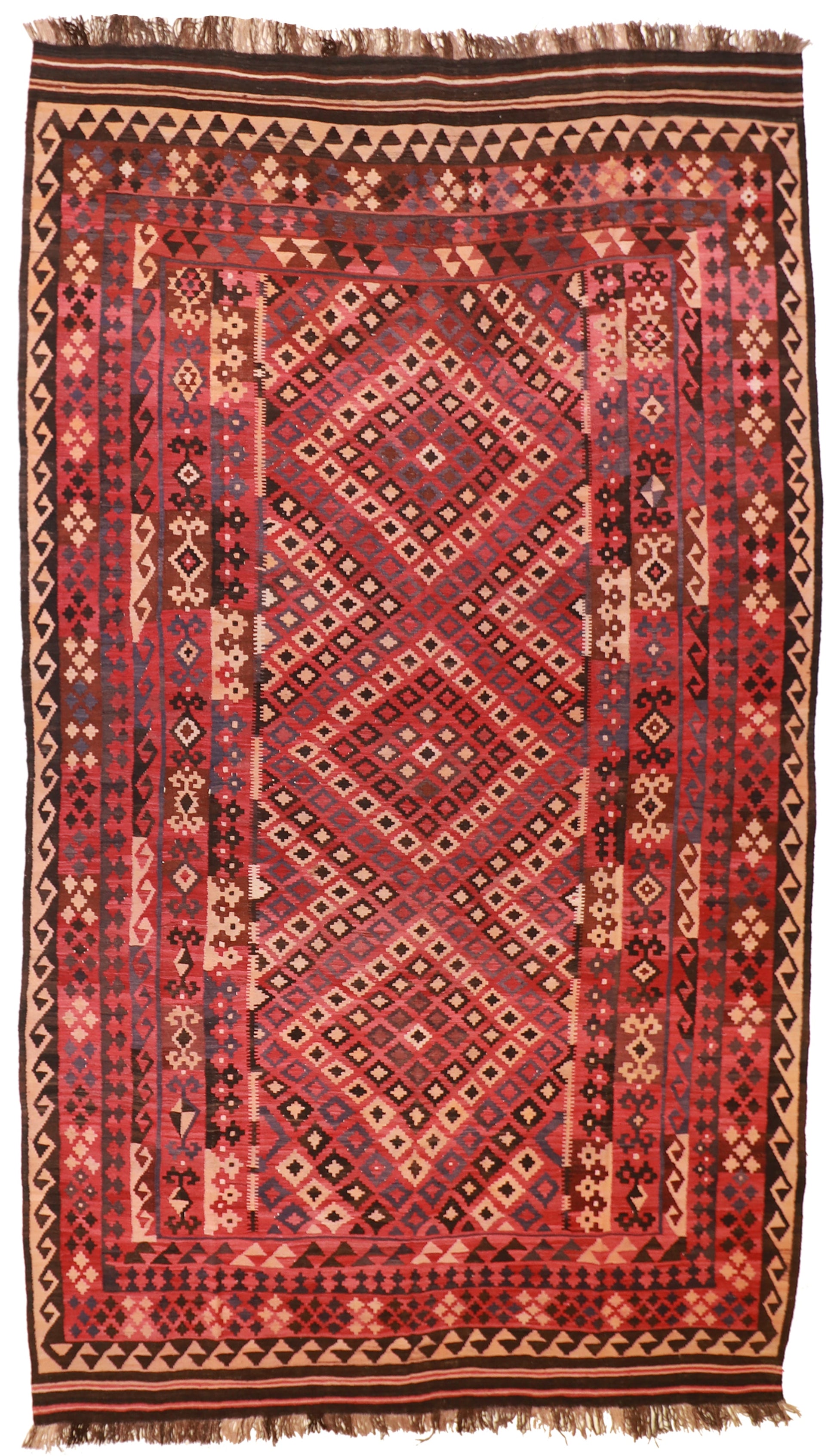 This exquisite 9x15.6 Kilim rug from Afghanistan boasts a vibrant color palette, featuring shades of Brown, Red, Black, Tan. Crafted with fine wool, this rug showcases a traditional Kilim design that adds a touch of elegance and a timeless charm to any space. With a thickness of 3/8 inch, this rectangular rug offers durability and comfort underfoot. Its size covers an impressive area, making it suitable for larger rooms. The Flatweave construction further enhances its durability, making it a perfect addition for high-traffic areas. Embrace the beauty and craftsmanship of this Kilim rug in your home.