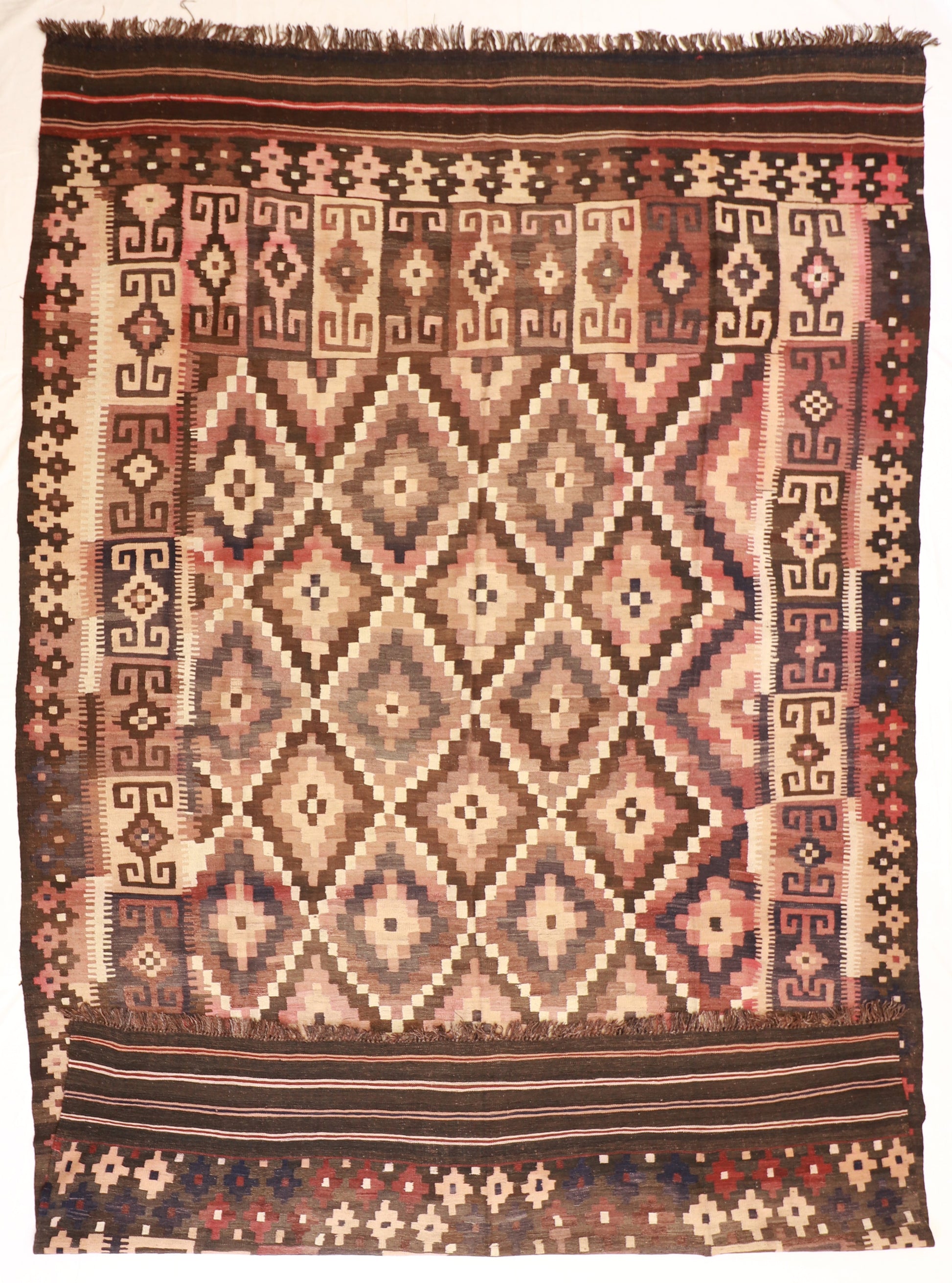 This exquisite 8.10x14.6 Kilim rug from Pakistan boasts a vibrant color palette, featuring shades of Brown, Tan, Red. Crafted with wool, this rug showcases a traditional Kilim design that adds a touch of elegance and a timeless charm to any space. With a thickness of 3/8 inch, this rectangular rug offers durability and comfort underfoot. Its size covers an impressive area, making it suitable for larger rooms. The Flatweave construction further enhances its durability, making it a perfect addition for high-traffic areas. Embrace the beauty and craftsmanship of this Kilim rug in your home.