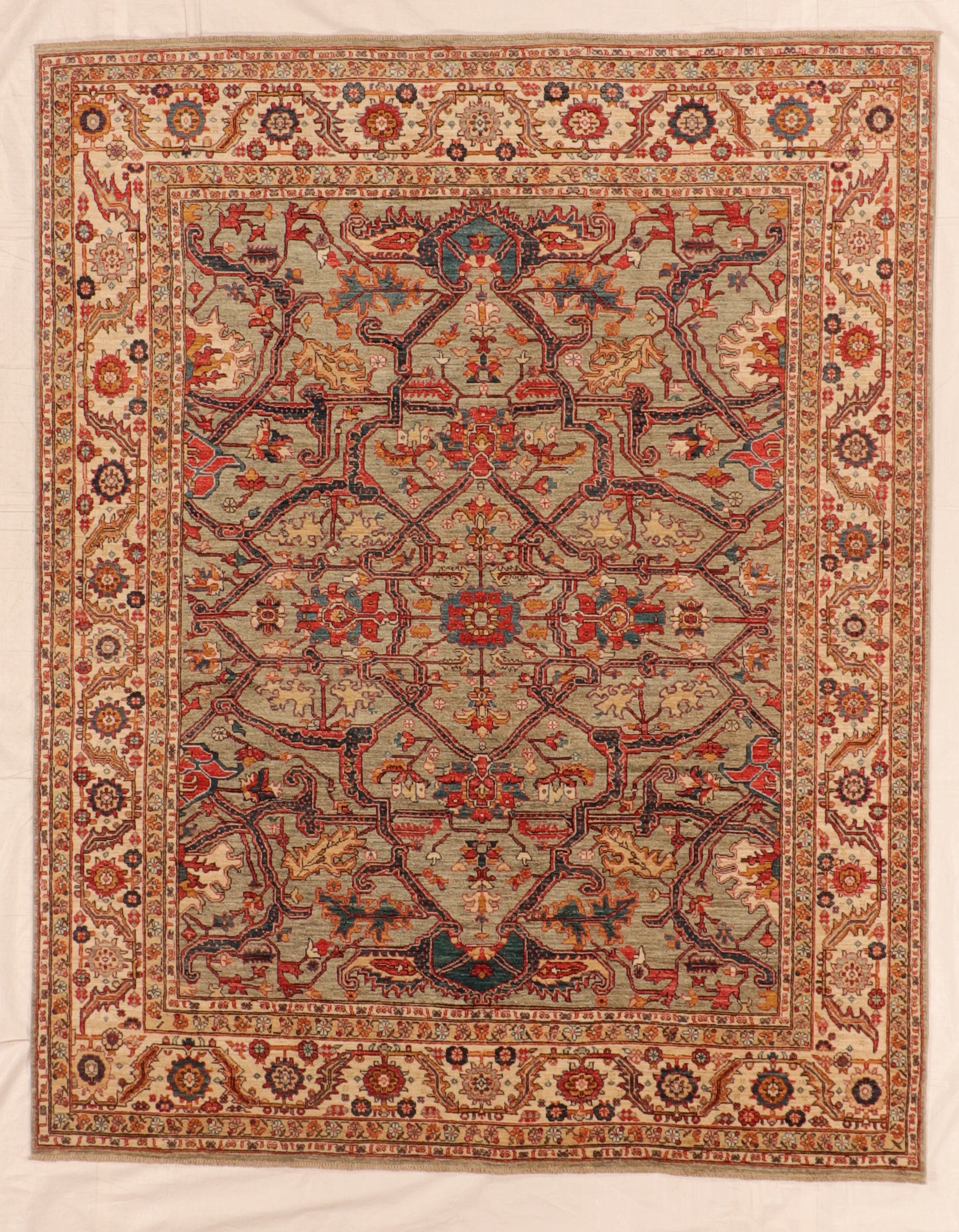 Classic Serapie medallion work, bold vine scrolls, and a sage–red–ivory palette — a heritage-inspired anchor for refined interiors.