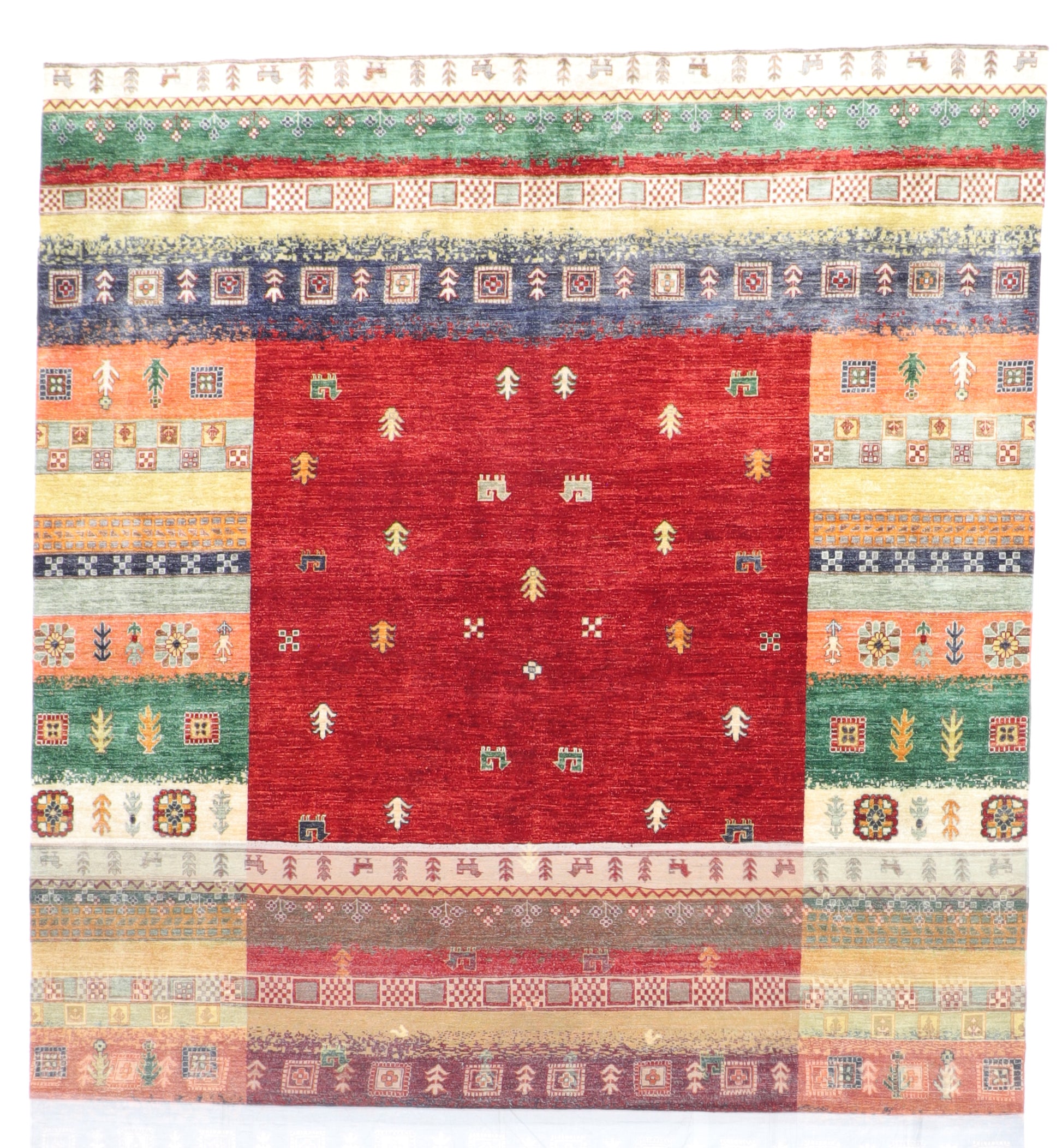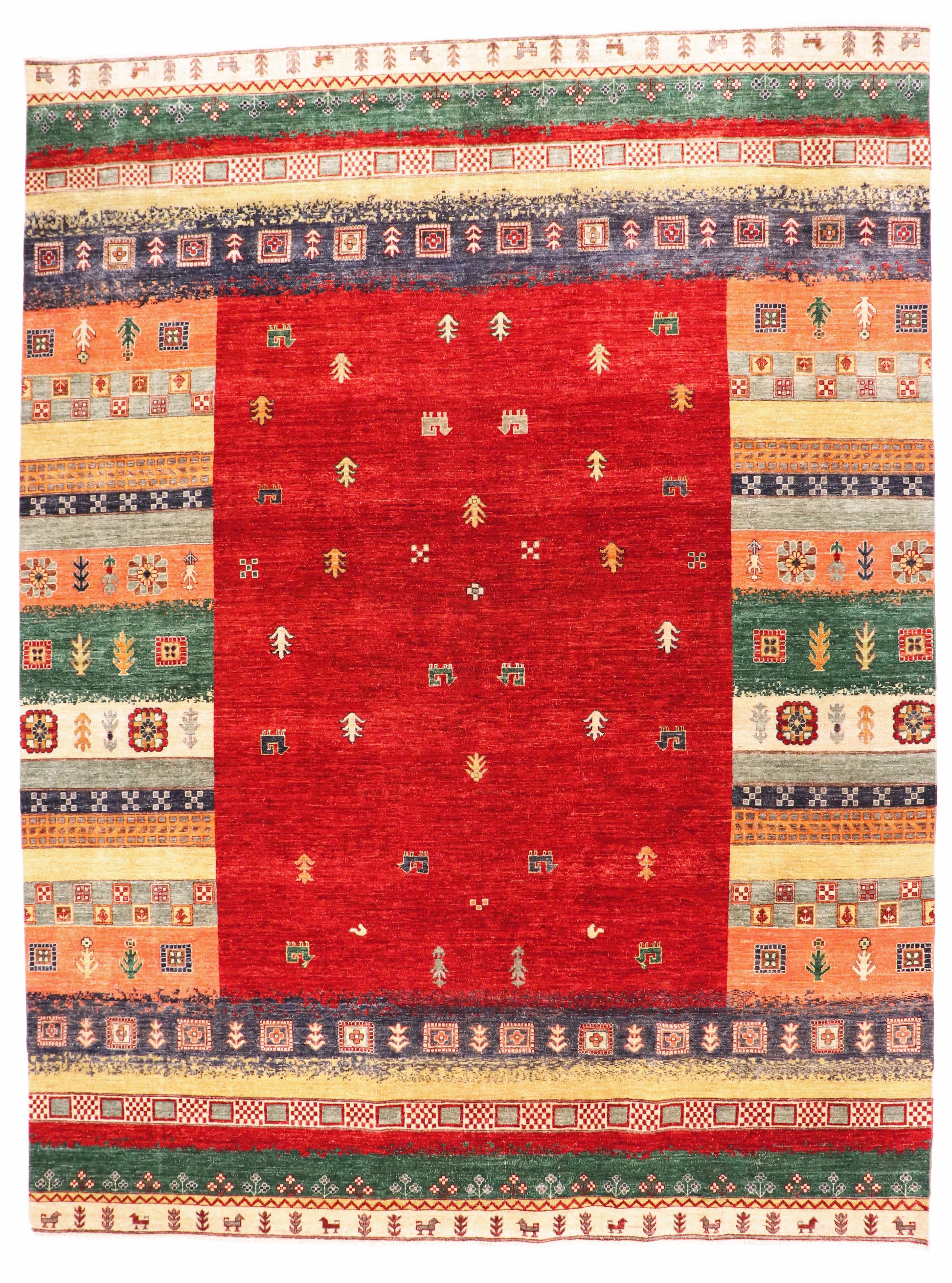 This Gabbeh Rug showcases the expressive freedom that defines Gabbeh weaving. A rich red central field anchors the composition, scattered with small symbolic motifs—trees, animals, and geometric forms—each woven with intentional simplicity. Surrounding borders unfold in layered bands of color and pattern, creating a lively yet balanced frame.