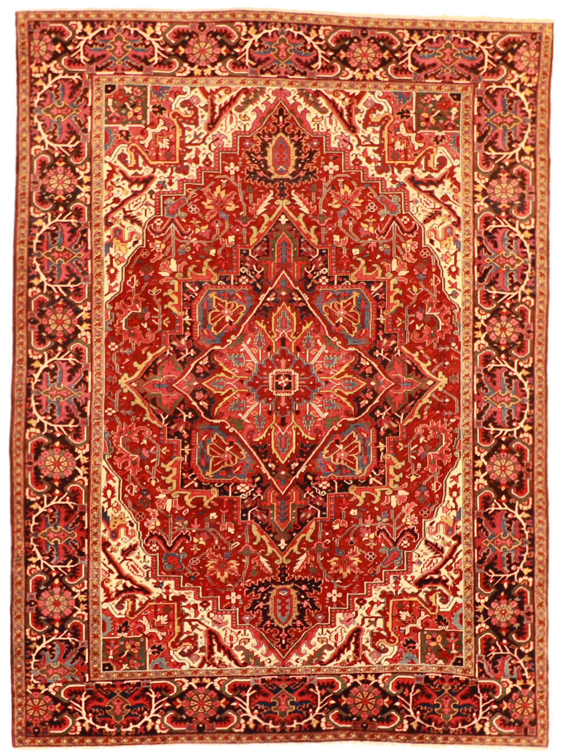 Saturated red, iconic medallion geometry, and heirloom wool craftsmanship.